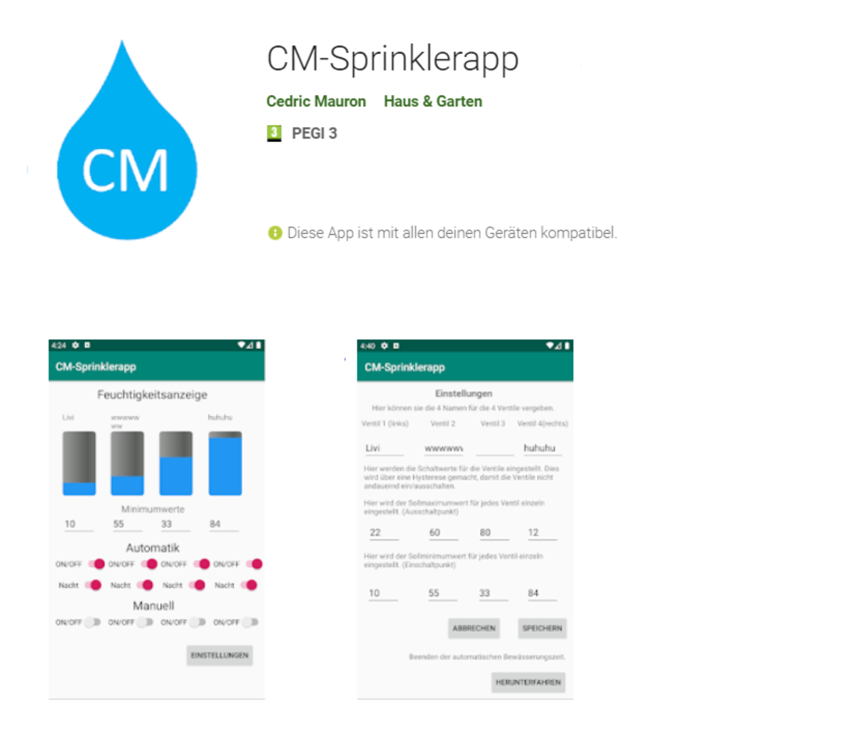 In dieser Diplomarbeit wurde eine automatische Gartenbewässerung programmiert und entwickelt. Diese kann mit der eigens dazu programmierten App überwacht und gesteuert werden.