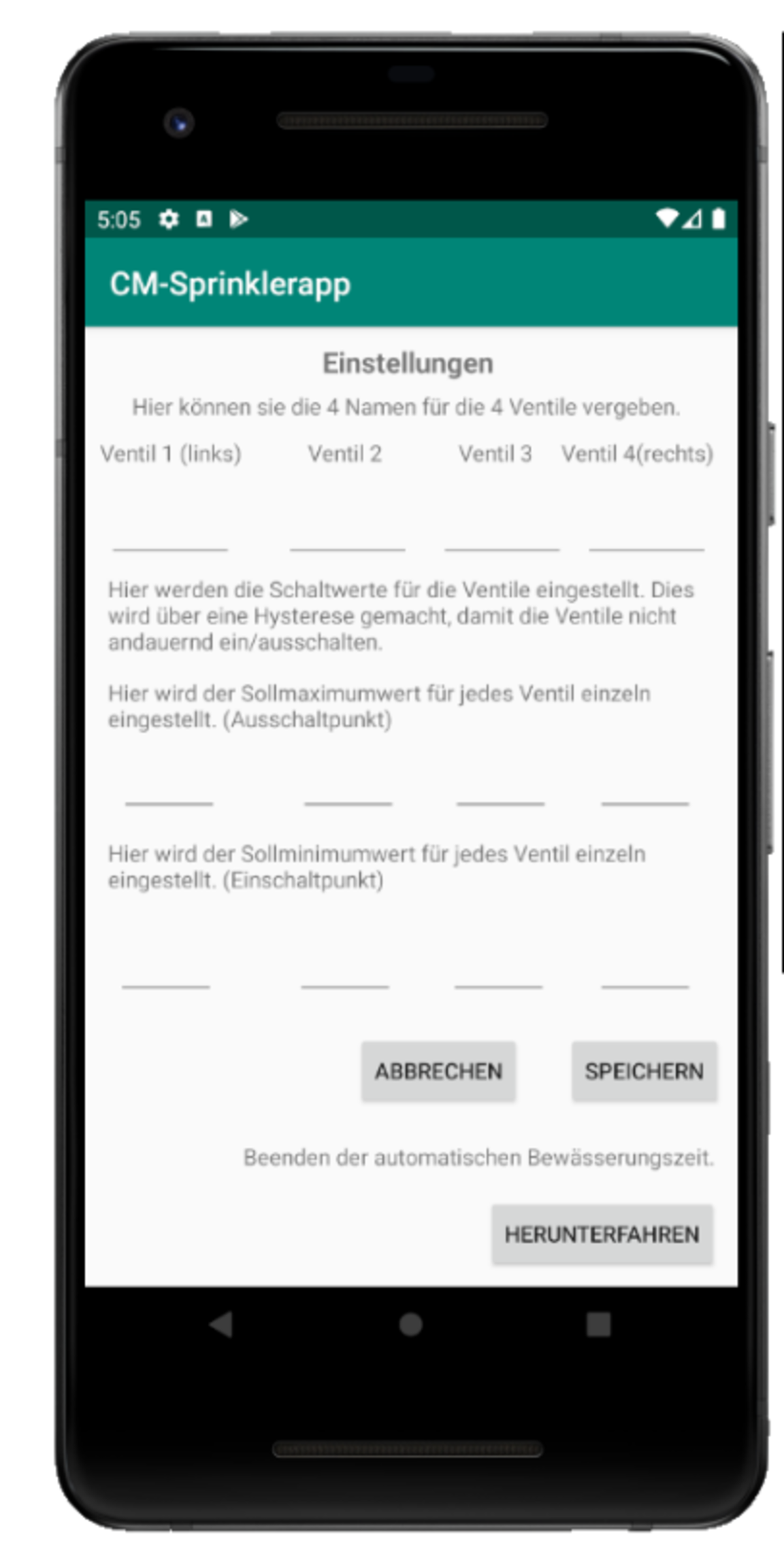 Auf der Einstellungsseite werden die Namen für die vier Ventile vergeben und die dazugehörigen Minimum- und Maximumwerten. Die Änderungen werden mit Speichern übernommen und mit Abbrechen kann man ohne zu Speichern auf die Hauptseite zurückkehren. Wenn die automatische Gartenbewässerung nicht mehr benötigt wird, kann man den RaspberryPi mit dem Knopf Herunterfahren ausschalten.