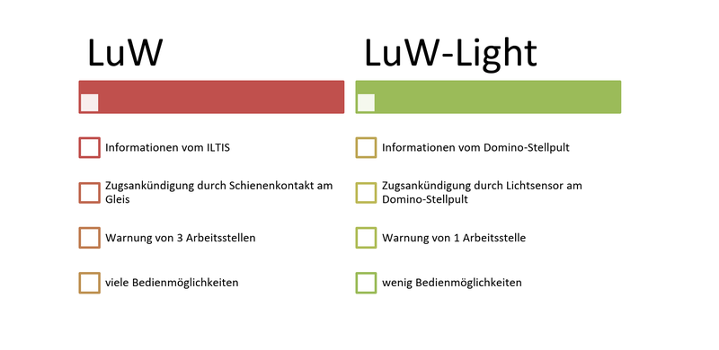 Einleitung: Das Bauvolumen und die Anzahl Baustellen im Schienenverkehr steigen stetig. Um die Arbeiter auf der Baustelle von herannahenden Schienenfahrzeugen zu warnen, wird heute meistens die konventionelle Warnung eingesetzt. Dabei befindet sich das Sicherheitspersonal beziehungsweise das autonome Warnsystem am Gleis und warnt so vor Ort die Arbeitenden. Der Nachteil dieser Warnung ist, dass viele Züge gemeldet werden, obwohl diese nicht auf die Gleisarbeitsstelle fahren. Dies führt zu unnötigen Arbeitsunterbrüchen auf der Baustelle. Weitere Nachteile sind, fehlende Übersicht bei komplexen Gleistopologien oder fehlende Sichtweiten. Aus diesen genannten Gründen wurde das System LuW, Leitsystem unterstütztes Warnen, entwickelt. Da LuW nur bei Stellwerken eingesetzt werden kann, die über das Leitsystem ILTIS verfügen, kam der Wunsch auf auch bei Stellwerken ohne ILTIS so zu warnen. Deshalb ist der Prototyp LuW-Light entwickelt worden. LuW-Light soll bei Stellwerken mit einem Domino-Stellpult Übersicht verschaffen und eine Baustelle nur dann warnen, wenn es nötig ist.