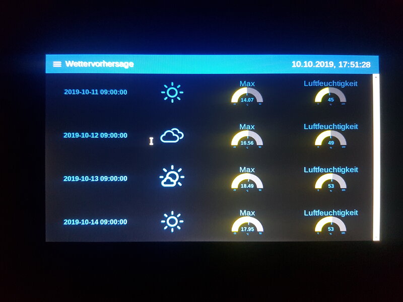 - Auf einer Seite werden die nächsten vier Tage als Wettervorhersage mit der Maximaltemperatur sowie der Luftfeuchtigkeit dargestellt.