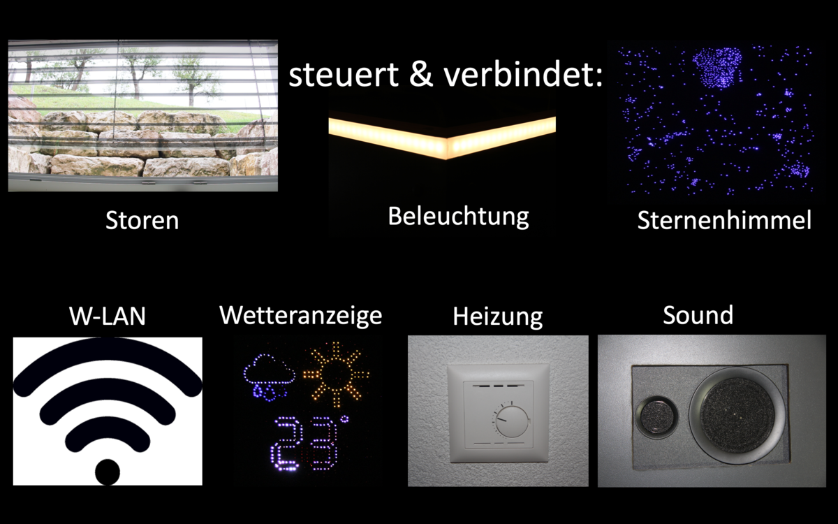 - Steuert Storen, Heizung, Beleuchtung, Wetter, Sterne, W-LAN & Sound