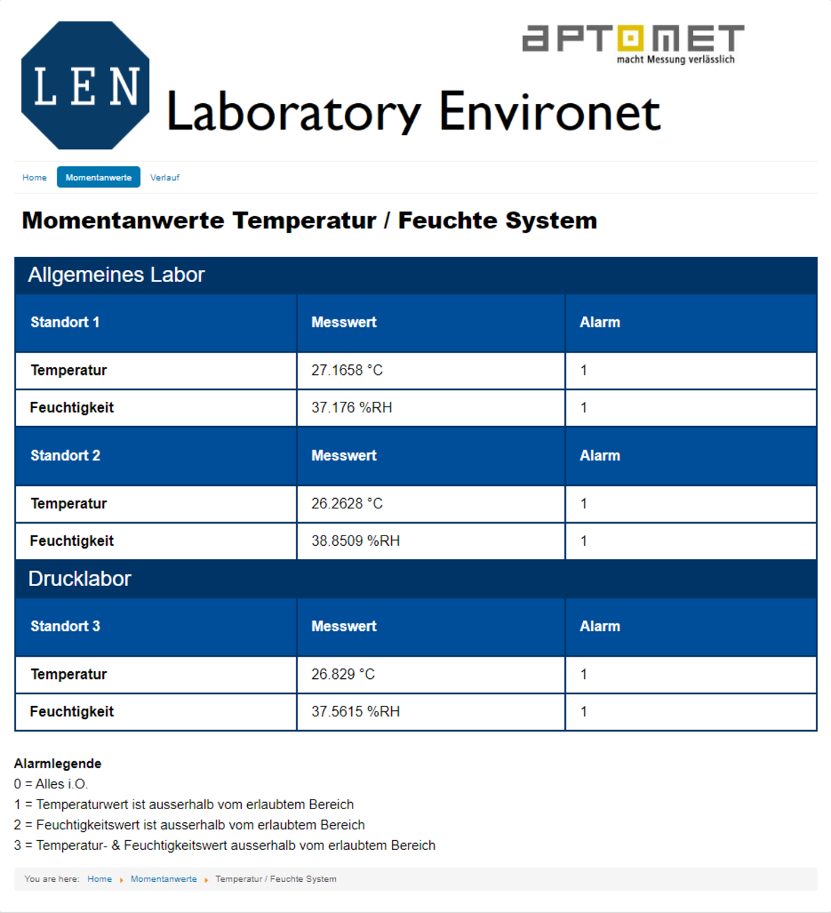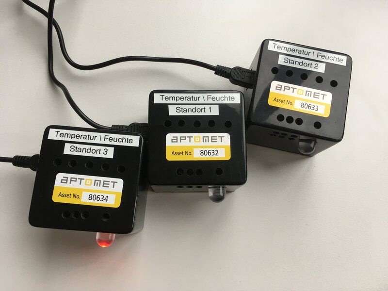 Die Firma Aptomet AG ist ein akkreditiertes Labor (SCS) und ist verpflichtet in den Laboren eine kontinuierliche Aufzeichnung der Umgebungstemperatur und -luftfeuchtigkeit zu machen. Diese Daten werden zur Überprüfung an die Akkreditierungsstelle geschickt.