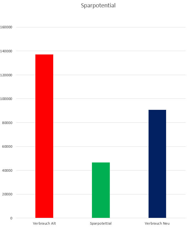 Für die Errechnung habe ich die Daten der Firma gesammelt und alle Verbraucher ausgelesen. anschliessend habe ich eine Modulierbare Tabelle erstellt welche die Daten sofort verwertet und errechnet. So kann das Sparpotential aller elektrischen Verbraucher errechnet werden. Natürlich im Zusammenhang mit dem erarbeitetem Konzept.