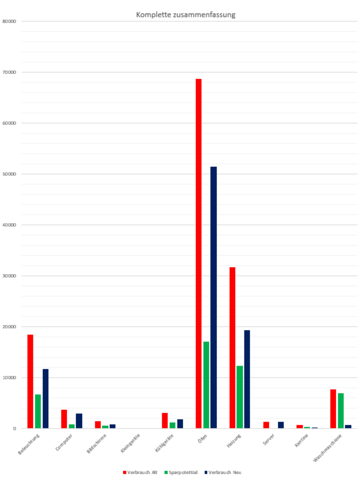 Man kann bei den Diagrammen deutlich erkennen das die Hautverbraucher wie erwähnt die elektrisch-thermischen sind. Des weiteren sind aber auch Punkte wie Beleuchtung, Computer und Kühlgeräte Verbraucher welche aufs Jahr gerechnet doch einiges ausmachen. So können mit der Umsetzung meines Konzeptes bis zu 7'000 CHF Jährlich eingespart werden. Je nach Strompreis, dieser ist auch modulierbar und kann schnell angepasst werden, die Tabelle errechnet dann den neuen Wert.