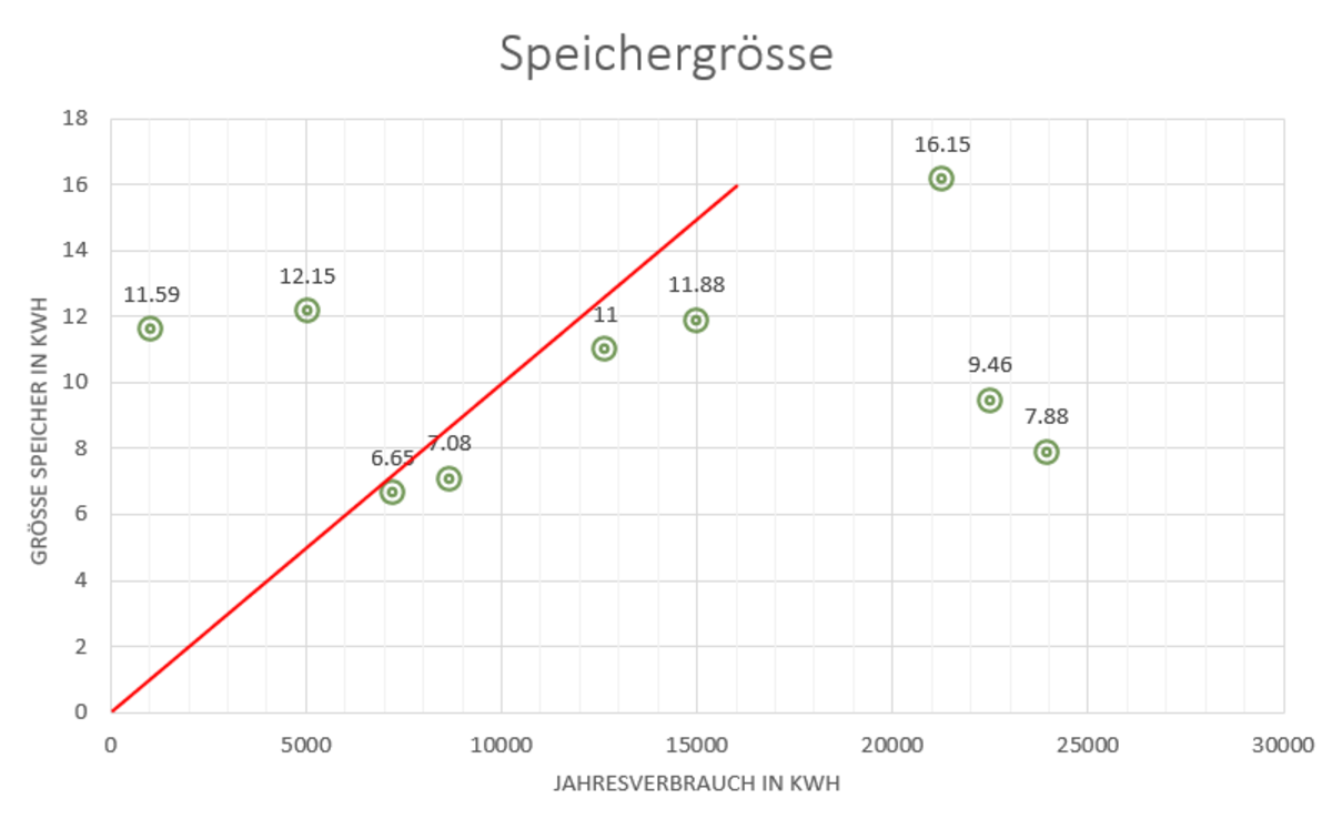 Die durchschnittliche Einspeisung pro Tag ergibt somit die Speichergrösse. Dies hat den Vorteil, dass die Formel auf verschieden Jahreszeiten oder Monate angewendet werden kann. Voraussetzung ist, dass eine Messung des Eigenverbrauches und der Produktion für mindesten ein Jahr gemacht wurde. Somit kann der Speicher auf die gewünschten Monate dimensioniert werden. Diese Messung muss ohnehin bei der Installation eines Speichersystems umgesetzt werden. Die Grafik "Dimensionierung" zeig ein paar reale Anlagen bei welchen ich die Formel angewendet habe. Die rote Linie zeigt die Dimensionierung mit einer gängigen Faustformel aus der Praxis. Dabei wird der Jahresverbrauch durch 1000 geteilt und man erhält die Speichergrösse. Sämtliche Anlagen rechts der roten Linie sind somit mit meiner Formel kleiner dimensioniert als wenn die Dimensionierung mit der Faustformel gemacht worden wäre. Als Referenzmonate habe ich September, November, Januar und März gewählt. Dies da eine Speicherdimensionierung auf die Sommermonate wenig sinnvoll ist, da sich die Überproduktion in den Sommermonaten nur zu kleinen Teilen einspeichern lässt.