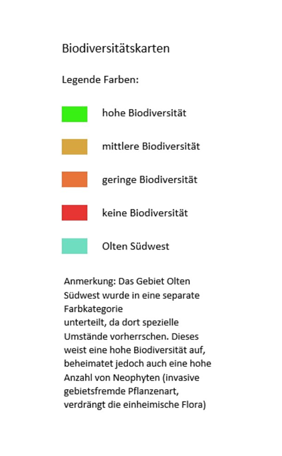 Der Verlust, der Biodiversität bedroht mittel- und langfristig die Nahrungsmittelsicherheit der wachsenden Bevölkerung. Durch zu hohen Einsatz von Pestiziden, Monokulturen oder Urbanisierung schwindet die Artenvielfalt rasant. Mithilfe der Arbeit soll ein Teil dazu beigetragen werden, die Biodiversität in der Stadt Olten zu fördern. Durch die Verbesserung der Biodiversität werden nicht nur Arten gefördert, sondern das Stadtklima verbessert und eine Steigerung des Erholungsfaktors der Bevölkerung erzielt.