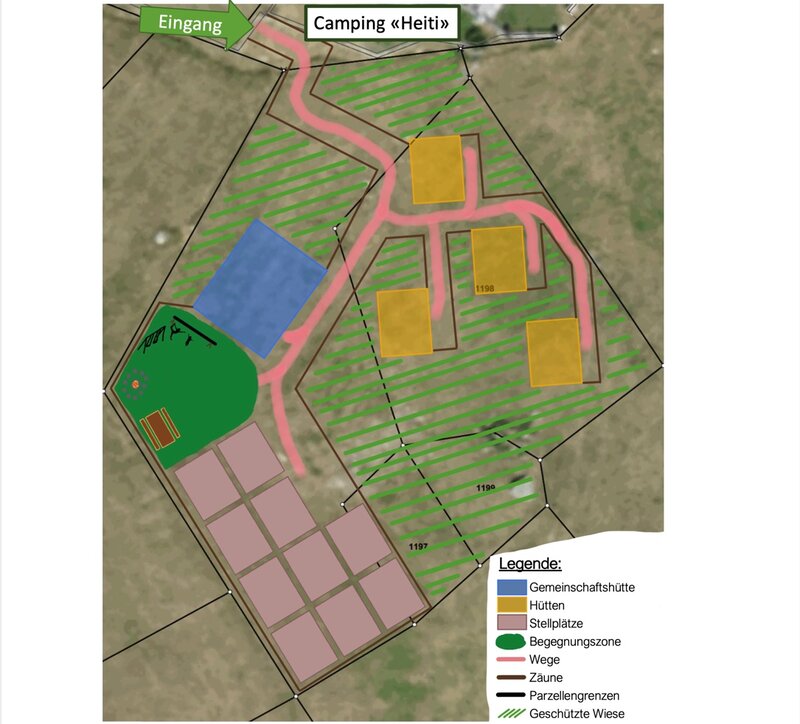 Wir besitzen dort 1'015 m^2 Bauland, worauf wir unser Projekt "Nachhaltiger Gebirgscamping", mit dem Namen "Heiti", verwirklichen wollen.