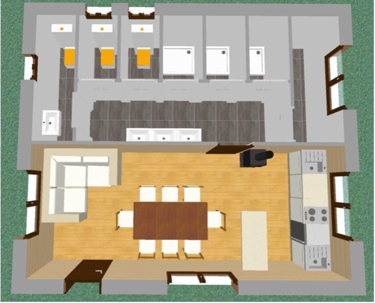 Der ermittelte Wärmebedarf der Gebäude kann mit Pelletöfen abgedeckt werden. Es wird jeweils ein kleiner Pelletofen in den Hütten und ein wasserführender Pelletofen in der Gemeinschaftshütte installiert.
