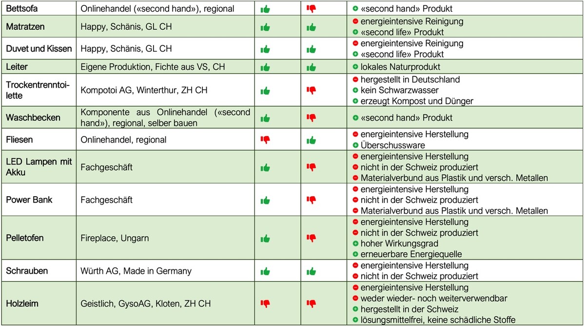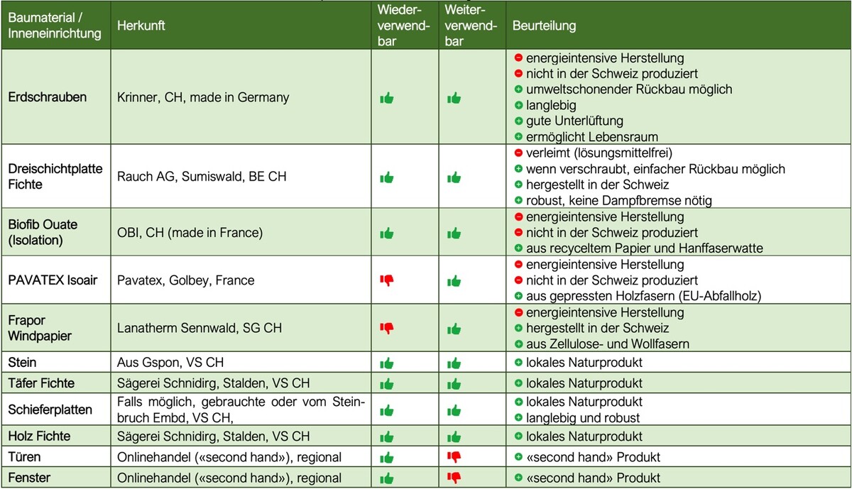 Abschliessend wurden alle Bauten einer Beurteilung und einem Nachhaltigkeitscheck unterzogen. Dies ergab, dass praktisch alles wieder- und/oder weiterverwendet werden kann, jedoch teils die Herstellung energieintensiv ist und nicht alles lokal bezogen werden kann.