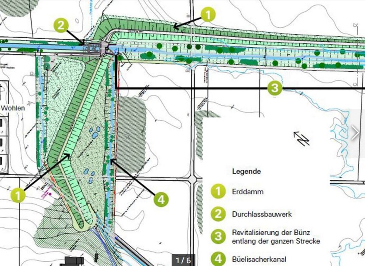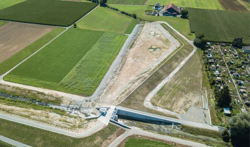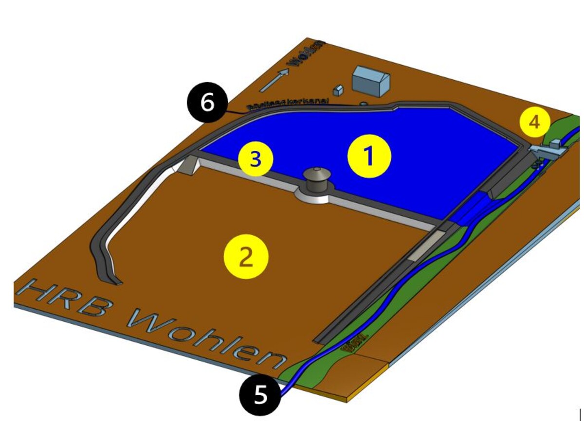 Als Vorlage für die technische Konzeption diente das HRB Wohlen mit einem maximalen Fassungsvermögen von 600.000m3. Die Überflutungsfläche entspricht bei einem Hochwasserereignis (HQ 100) rund 42 Ha.