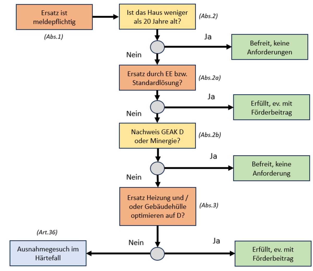 Das revidierte kantonale Energiegesetz ist am 1. Januar 2023 in Kraft getreten. Diese Diplomarbeit beschäftigt sich mit dem Artikel 40a, welcher den Ersatz von Wärmeerzeugern regelt. Der Ersatz eines Wärmeerzeugers ist neu meldepflichtig und an bestimmte Anforderungen gebunden. Dabei stehen 12 Standardlösungen und die Gesamtenergieeffizienz im Fokus. Mit zwei Fallbeispielen wird ein praxisorientierter Bezug zu diesen Massnahmen aufgezeigt. Während im alten Mehrfamilienhaus der Wärmeerzeugerersatz über eine der Standardlösungen ermöglicht werden soll, wird im zweiten Fallbeispiel auf einen Ersatz über die Gesamtenergieeffizienz abgezielt.