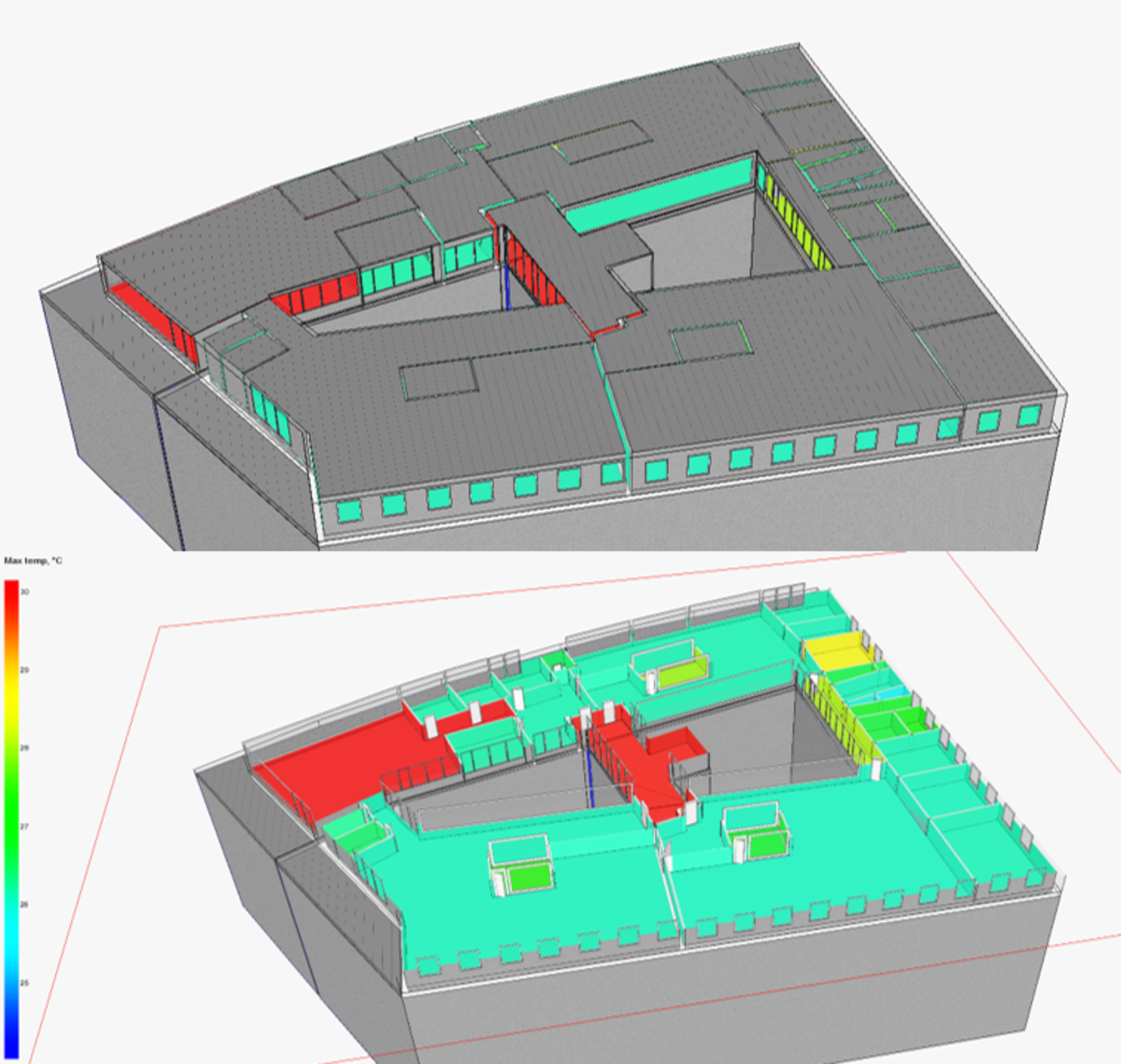 Die Analyse zeigt, dass in den derzeitigen Heizungs-, Kühlungs- und Lüftungssystemen der Büroflächen der EPRO GROUP erhebliches Optimierungspotenzial besteht. Die Simulationsergebnisse ergeben, dass die aktuelle Heizleistung in vielen Räumen nicht ausreicht, um die gewünschten Sollwerte zu erreichen, während die Kühlung überdimensioniert ist.