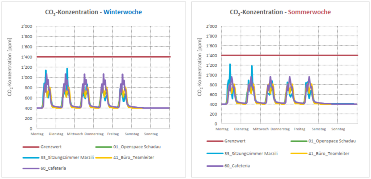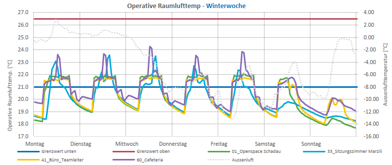 Als eine niederschwellige Massnahme wird die Anpassung der projektspezifischen Sollwerte gemäss der "SIA 2024" angepasst. Durch gezielte Reduktion der Heiz- und Kühltemperaturen sowie der Laufzeitoptimierung der Lüftungsanlage, kann der Energiebedarf erheblich gesenkt werden. Diese Massnahme bietet eine potenzielle Einsparung von bis zu 38% im Heizbetrieb und 59% im Kühlbetrieb.