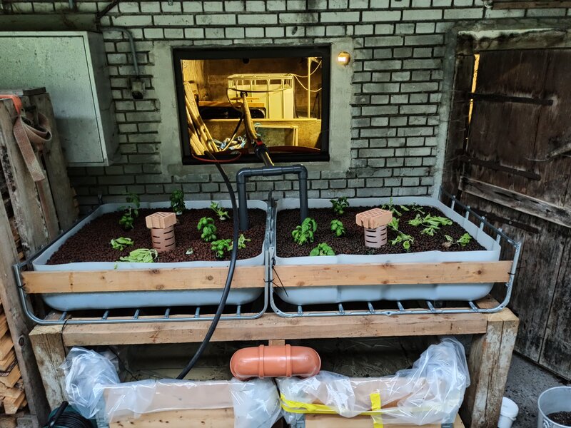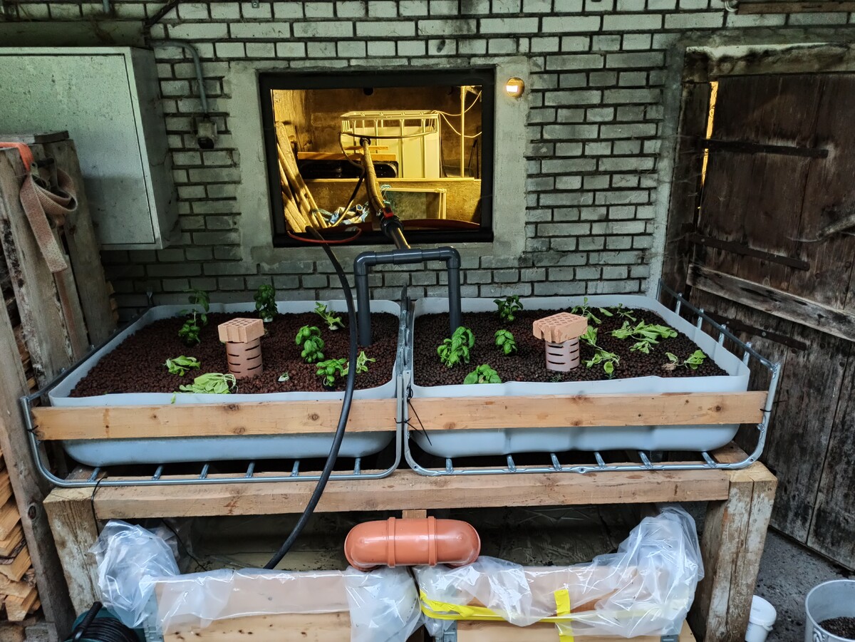 Parallel zu den Schreibarbeiten wurde in einer praktischen Arbeit ein Aquaponiksystem gebaut. Dies begann mit der Planung, welche die Örtlichkeit, die Grösse und die Art des Systems beinhaltete. Als dies klar war kauften wir alle nötigen Komponenten, dies erwies jedoch als schwieriger als angenommen. Das System wurde auf IBC-Tanks basierend aufgebaut. Diese dienen als Fisch- und Beetbehälter. Für die Stützkonstruktionen wurde Holz verwendet, welches vor Ort zur Verfügung stand. Parallel zu den Bauarbeiten am System, wurden Pflanzen gesät und zu Setzlingen gezogen. Als das System aufgebaut war, starteten wir mithilfe eines Bakterienkonzentrates die Bakterienkolonie, die sich wie geplant im Beet-Substrat ansiedelten. Nach einigen Wochen konnten wir Nitrid- und Nitratwerte messen, welche die Umwandlungsprodukte der Bakterien sind.