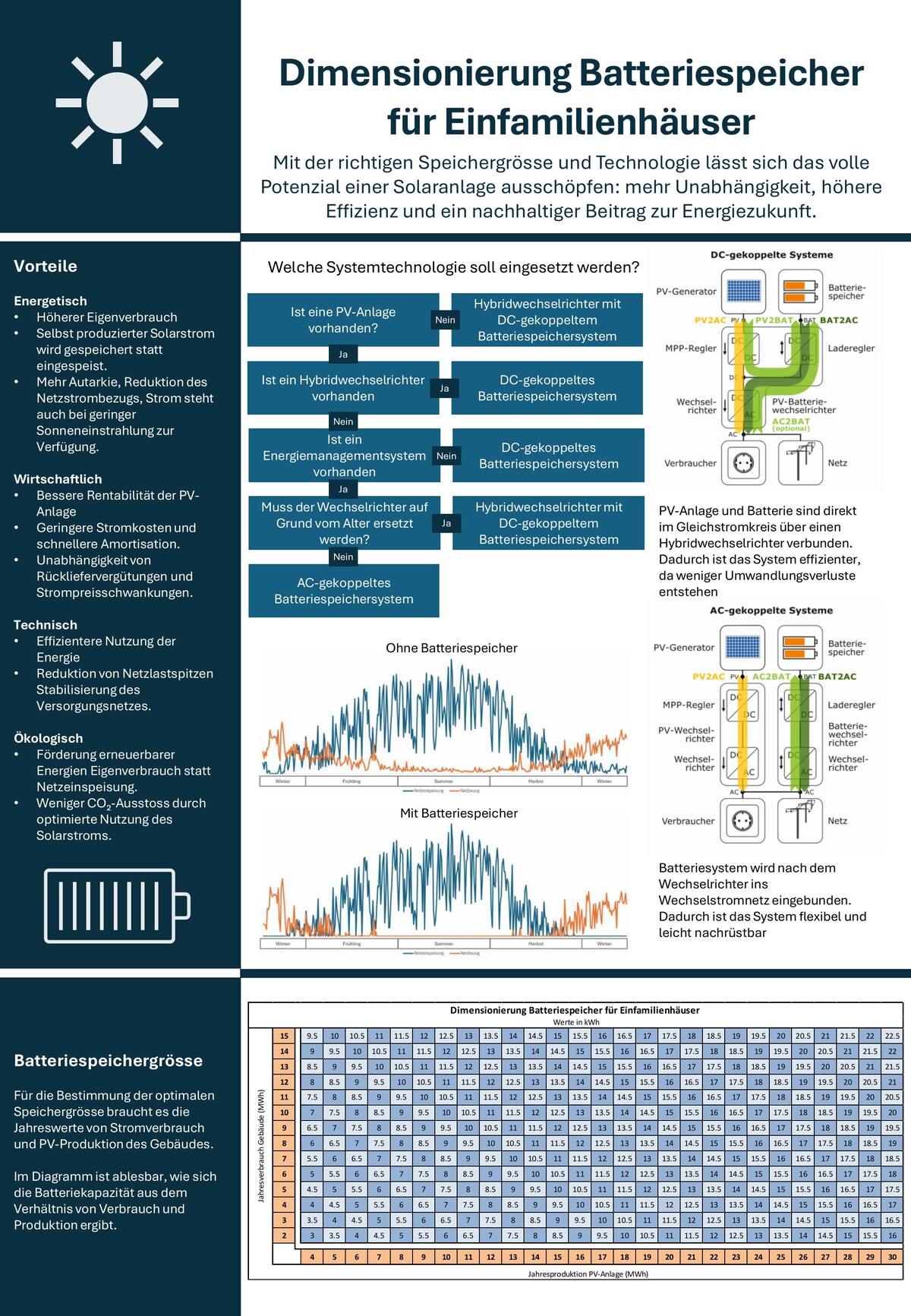 Die Diplomarbeit befasst sich mit der Dimensionierung eines Batteriespeichers für Photovoltaikanlagen im Einfamilienhausbereich. Ziel der Arbeit ist es, eine praxisnahe und einfach anwendbare Grundlage zu schaffen, mit der Berater und Anlagenbesitzer die optimale Speichergrösse bestimmen können, um sowohl den Eigenverbrauch zu maximieren als auch die Wirtschaftlichkeit sicherzustellen.