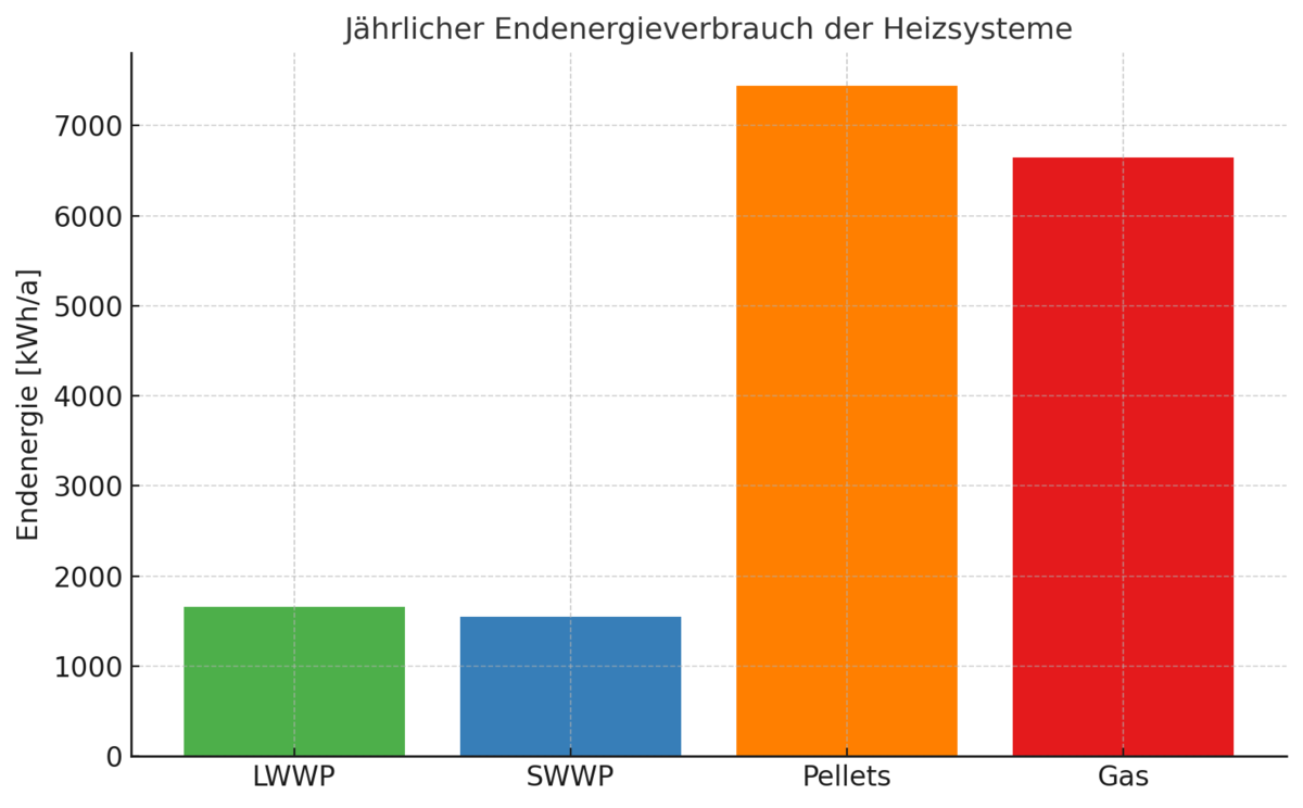 Damit wird klar: Wärmepumpen bieten die mit Abstand beste CO₂-Bilanz. Pelletheizungen stellen eine nahezu gleichwertige, biogene Alternative dar, jedoch werden bei der Verbrennung Feinstaubpartikel ausgestösst. Fossile Heizsysteme wie Gas hingegen liegen um Grössenordnungen höher und können die Anforderungen an eine klimaverträgliche Wärmeversorgung langfristig nicht erfüllen.