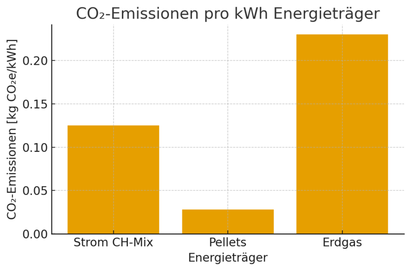 Auch die Pelletheizung liegt mit 4.17 Tonnen CO₂-Emissionen praktisch gleichauf (+7 %), verursacht jedoch einen höheren Energieeinsatz.