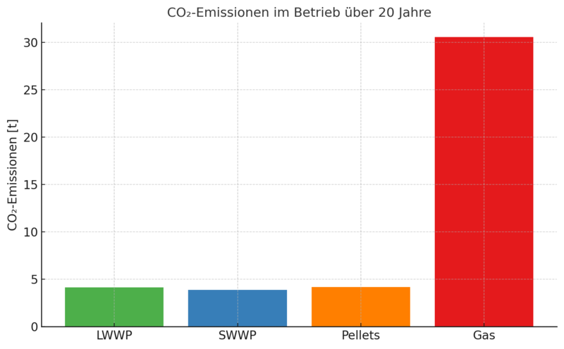 Der Vergleich der Heizsysteme über eine Betriebsdauer von 20 Jahren zeigt klare Unterschiede. Die Sole-Wasser-Wärmepumpe (SWWP) weist mit rund 3.88 Tonnen CO₂-Emissionen die beste Bilanz im Betrieb auf.