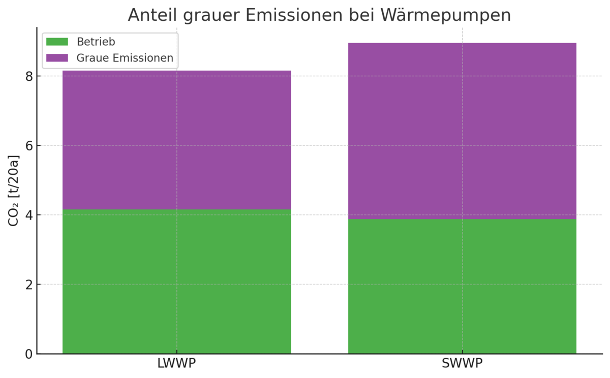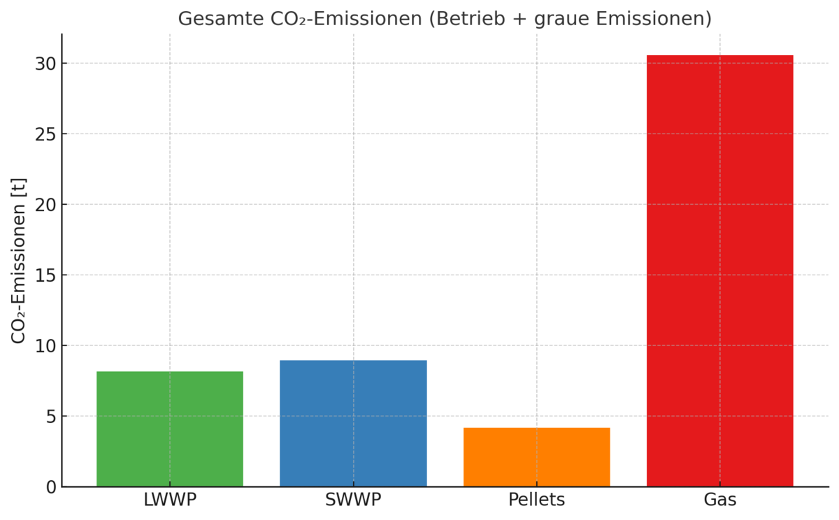 Sehr nahe folgt die Luft-Wasser-Wärmepumpe (LWWP) mit 4.15 Tonnen CO₂-Emissionen, was lediglich +7 % mehr gegenüber der SWWP bedeutet.