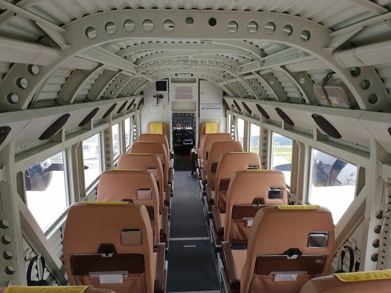 In den 1980er wurde, durch die in Dübendorf ansässige JU-AIR, zwei Sitzreihen eingebaut. Dabei wurden Sitzschienen und eine massive Holzplatte auf den Wellblechboden geschraubt.