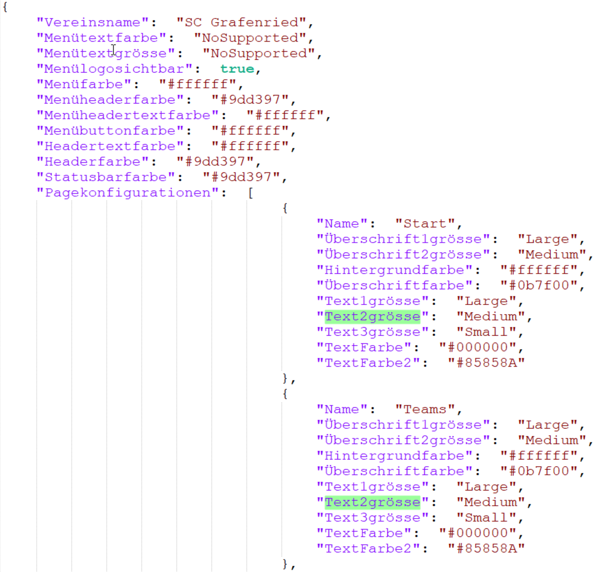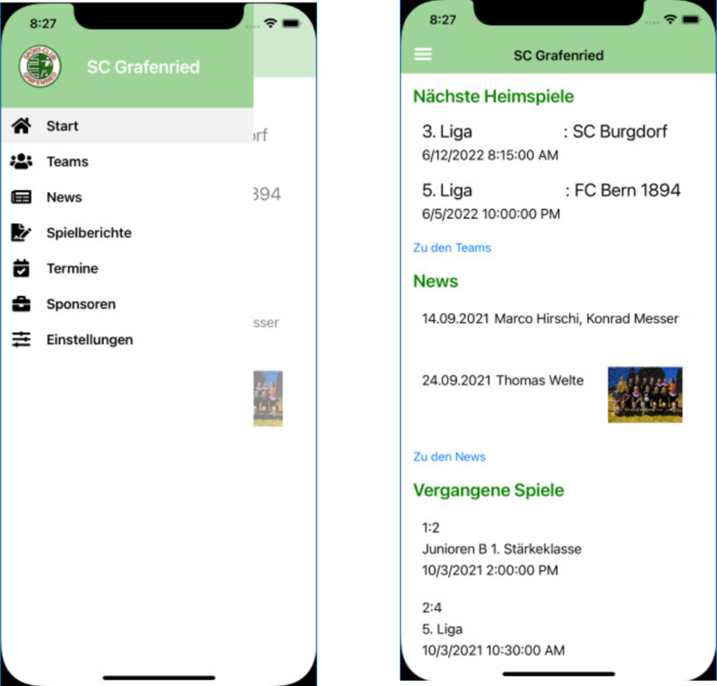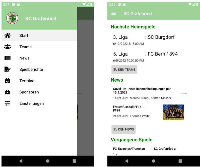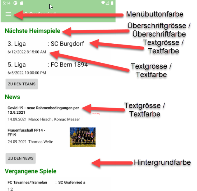 Ein grosser Fokus bei der Entwicklung lag auf der Konfigurationsdatei. Dieses ermöglichte Vereinen die komplette App optisch anzupassen. In einem einzelnen JSON File kann definiert werden wie die verschiedenen Elemente der App aussehen sollen. In der Fotogalerie ist ein Beispiel Bild hinterlegt.