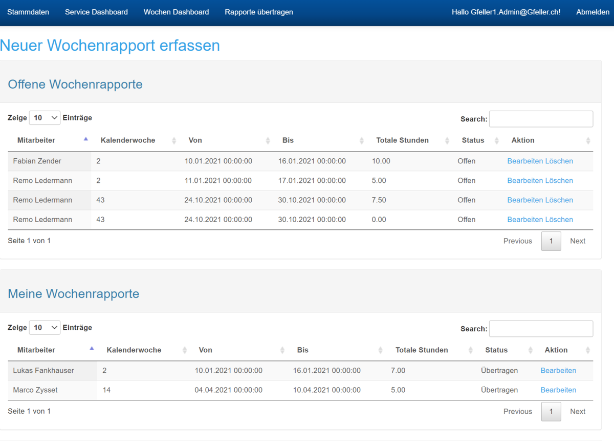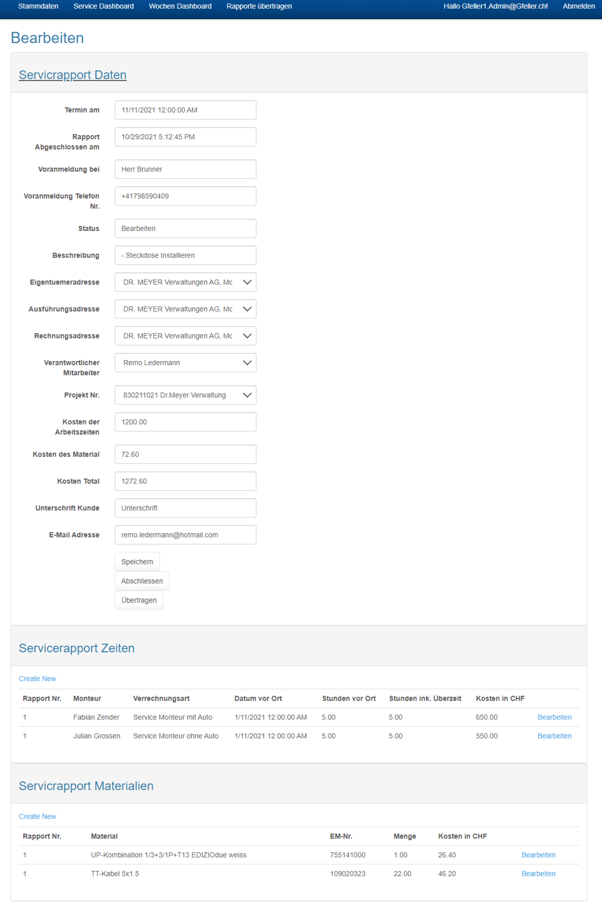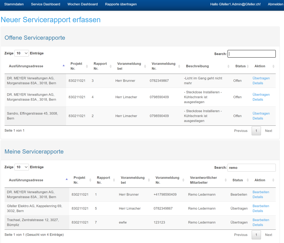 Alle Daten, die in den einzelnen Prozessschritten dieser beiden Hauptprozesse eingetragen werden, haben ein ähnliches Muster wie die Daten des bestehenden ERP-Systems. Dadurch wird die Umsetzung und Realisierung des Projekts vereinfacht. Die Daten aus den Servicerapporten, welche durch die Mitarbeiter erfasst werden, werden dann in der Applikation übersichtlich dargestellt.