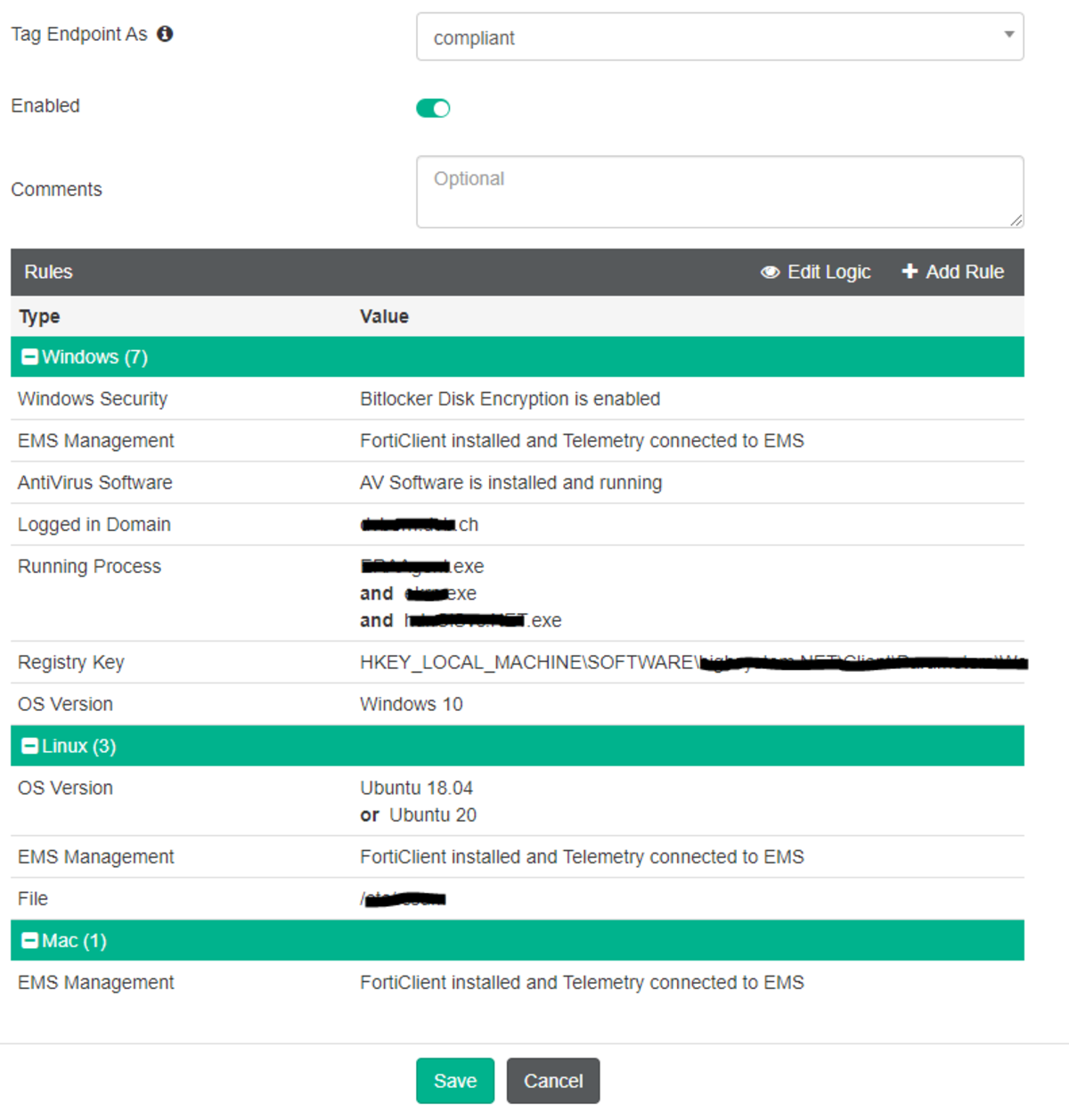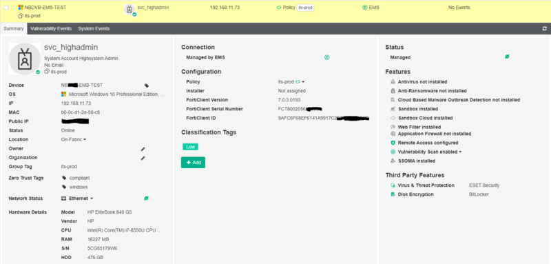 Die Abhängigkeit von Fortinet innerhalb des Netzwerkes beschränkt die möglichen Optionen. Die ebenfalls von Fortinet vertriebene Software «FortiClient EMS» (FortiClient Endpoint Management Server) bietet aber eine Lösung für diese Situation. Mit EMS können die Clients der Firma eindeutig verifiziert werden. Regelbasierte Gruppen (sogenannte Tags) prüfen die Eigenschaften eines Notebooks und können ihm den Zugriff auf das Firmennetz bei Erfüllung der Regeln gewähren. Werden die Regeln nicht erfüllt, kann ein Gerät vom Netzwerk isoliert werden. Die Endpoints können über den EMS verwaltet werden. Geräte, welche nicht im EMS registriert sind, können sich nicht mit dem Firmennetz verbinden. Da der EMS, die FortiGate (Firewall) und der FortiClient (VPN Client auf Firmengeräten) allesamt vom gleichen Hersteller sind, sollte das Zusammenspiel gut funktionieren. Der Laptop mit dem VPN Client von Fortinet soll sich beim EMS melden und als Firmengerät markiert werden. Ist dies erfolgreich soll die Firewall dem Gerät den Zugriff auf das interne Netz und das Internet erlauben.