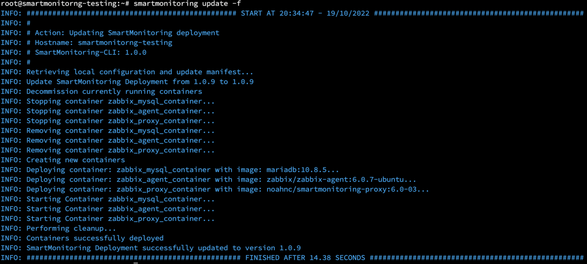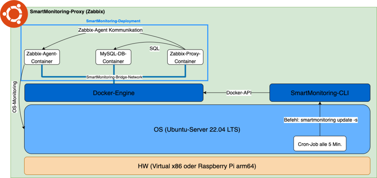 Nach einer genauen Analyse der Anforderungen kristallisierte sich als Lösung die Umsetzung mittels Docker heraus. Die Zabbix-Komponenten werden beim Kunden dabei als Container ausgeführt, die durch eine eigens entwickelte CLI-Applikation in regelmässigen Abständen auf neue Versionen oder Konfigurationen überprüft werden. Wird eine neue Version erkannt, führt die CLI-Applikation eigenständig und automatisiert ein Update durch. Sollten während dieses Prozesses Probleme auftreten, wird ein Fallback auf die vorherige Version durchgeführt, um den weiteren Betrieb vorerst gewährleisten zu können. Zusätzlich wird im Monitoring für den entsprechenden Kunden ein Alarm ausgelöst, der von einem Techniker geprüft werden kann.