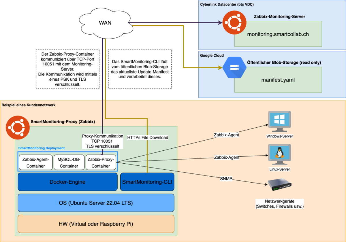 Damit das Monitoring von Kundeninfrastrukturen aus der Cloud heraus möglich ist, wird bei Zabbix eine zusätzliche Software benötigt. Diese wird beim Kunden installiert und fungiert als Vermittler zwischen den lokalen Geräten und dem Monitoring in der Cloud.
