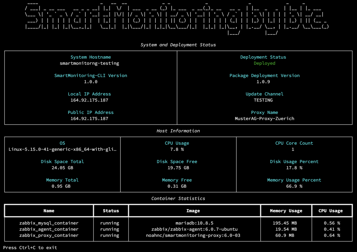 Ergänzt wird die CLI-Applikation durch weitere Funktionen wie ein Status-Dashboard, das essenzielle Informationen übersichtlich und zentral darstellt. Um auch aus der Ferne über die beim Kunden installierte Version informiert zu sein, werden diese und weitere Informationen im Monitoring gesammelt, wo eine zentrale Auswertung aller Systeme möglich ist.
