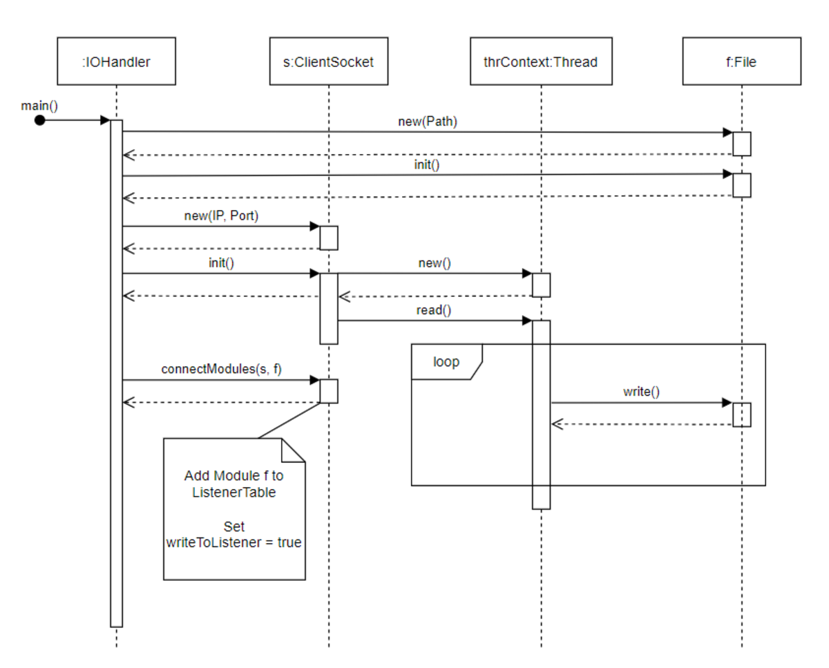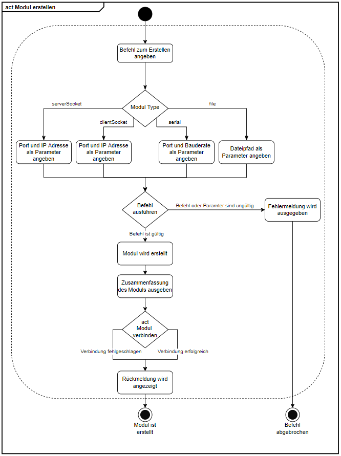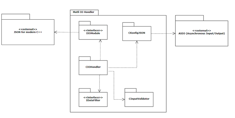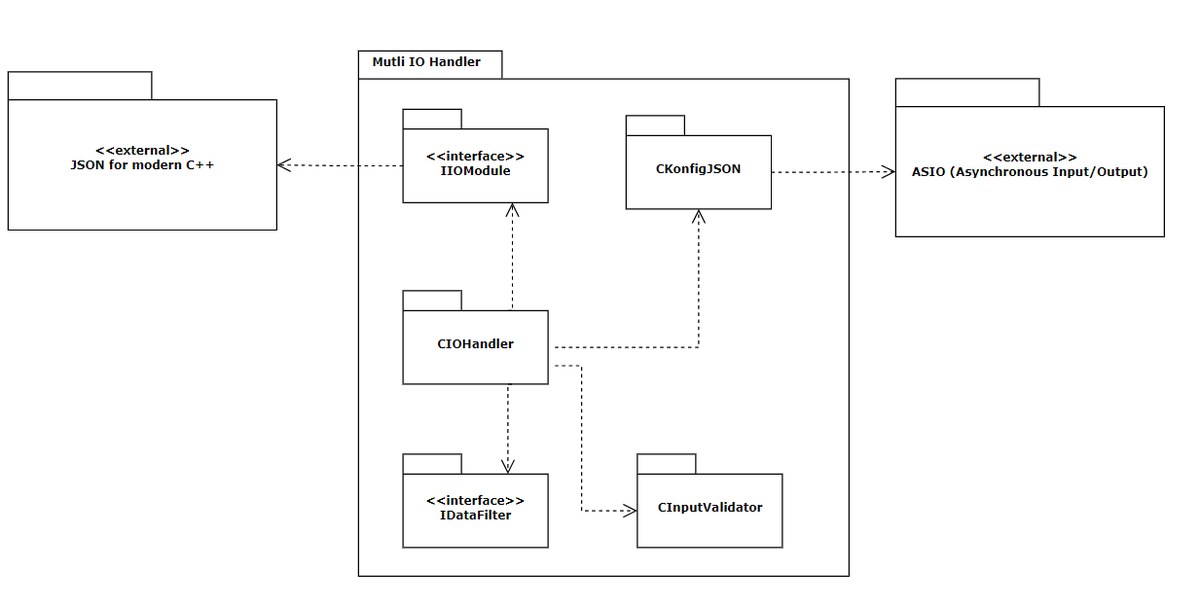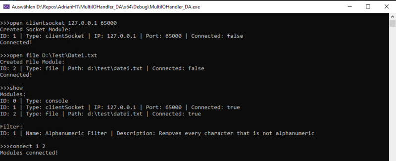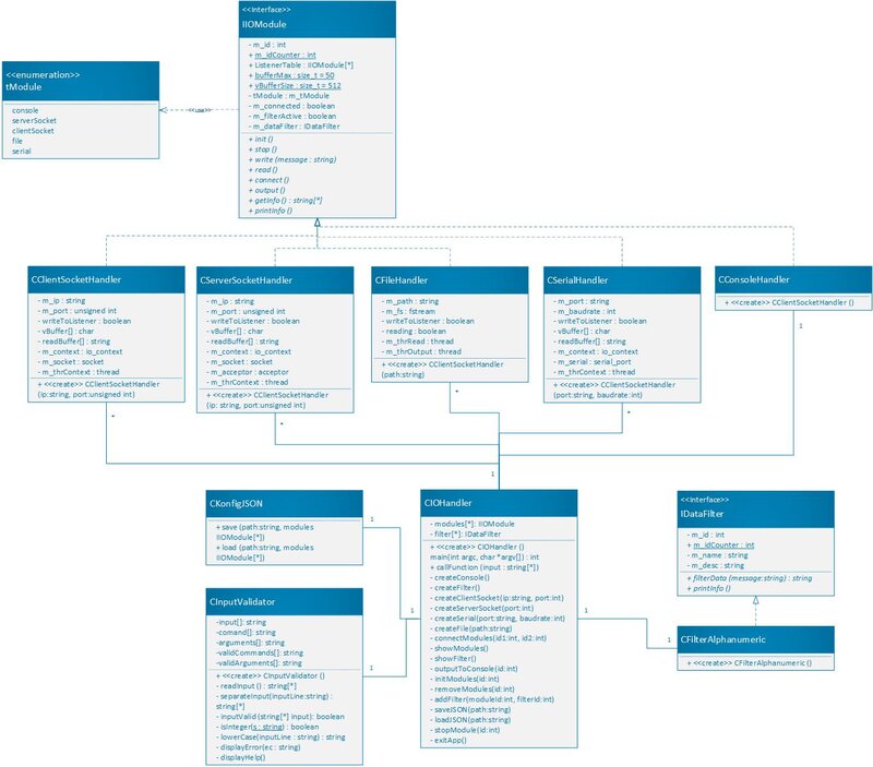 Ein Gerät kann entweder über ein Socket mit IP und Port oder ein Serial Port kommunizieren. Zusätzlich kann auch eine lokal abgelegte Datei eine Quelle darstellen. Für eine Socket Verbindung fungiert der Multi IO Handler entweder als Server, zu dem sich ein Gerät verbinden kann oder als Client, der sich zu einem Gerät verbindet. Für jedes dieser vier Optionen erstellt sich der Multi IO Handler ein Modul, um damit spezifische Funktionen auszuführen. Die Applikation ist im Stande, die Datenkommunikation von allen verfügbaren Modulen fortlaufend zu lesen und sie entweder in der Konsole auszugeben, um eine direkte Analyse zu erlauben oder sie an ein anderes Modul weiterzuleiten. Die Datenkommunikation des Multi IO Handler mit seinen verbundenen Modulen ist standardisiert, so dass jegliche Module miteinander verbunden werden können, unabhängig von deren Typ. Falls nötig kann einem Modul auch einen Inhaltsfilter hinzugefügt werden um die empfangenen Daten zu Filtern, bevor diese an die Quelle geschrieben werden.