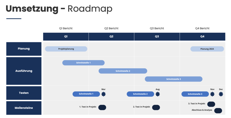 Umsetzung: Die Umsetzung basiert auf drei Schnittstellen, welche nacheinander realisiert werden können. Dank der Roadmap ist bereits ein realistischer Fahrplan für die Umsetzung vorhanden.
