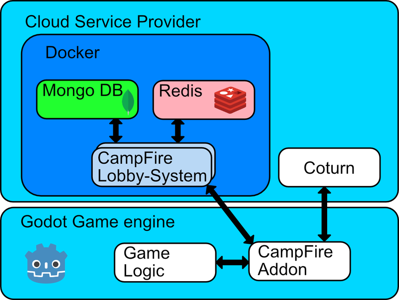 Dieses gesamte System besteht aus einer Serveranwendung, die als Docker-Image zur Verfügung gestellt wird. Dieses Image kann auf verschiedenen Cloud-Anbietern installiert werden, entweder direkt oder mit Docker-Verwaltungstools wie Kubernetes für mehr Kontrolle und Skalierbarkeit. Auf der Clientseite gibt es ein Godot-Add-On, das die Kommunikation mit dem Server verwaltet. Mit dem Add-On kommt auch ein Beispiel-User-Interface, die Idee ist jedoch, dass man eine eigene, an sein Spiel und seinen Art-Stil angepasste Benutzeroberfläche erstellt.
