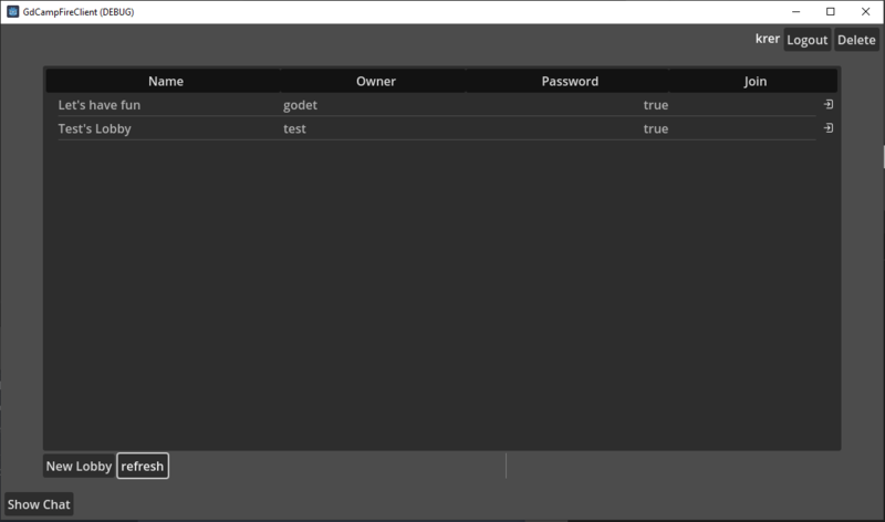 Auf der Game-Client-Seite besteht das System aus dem CampFireClient, einem Godot-Addon, welches den Login und die Kommunikation mit dem Server implementiert. Das Addon kommt mit einem rudimentären GUI-Beispiel, die Idee ist jedoch, dass der Entwickler das Addon-Interface benutzt, um eine eigene, auf sein Game und Artstil angepasste GUI zu implementieren.