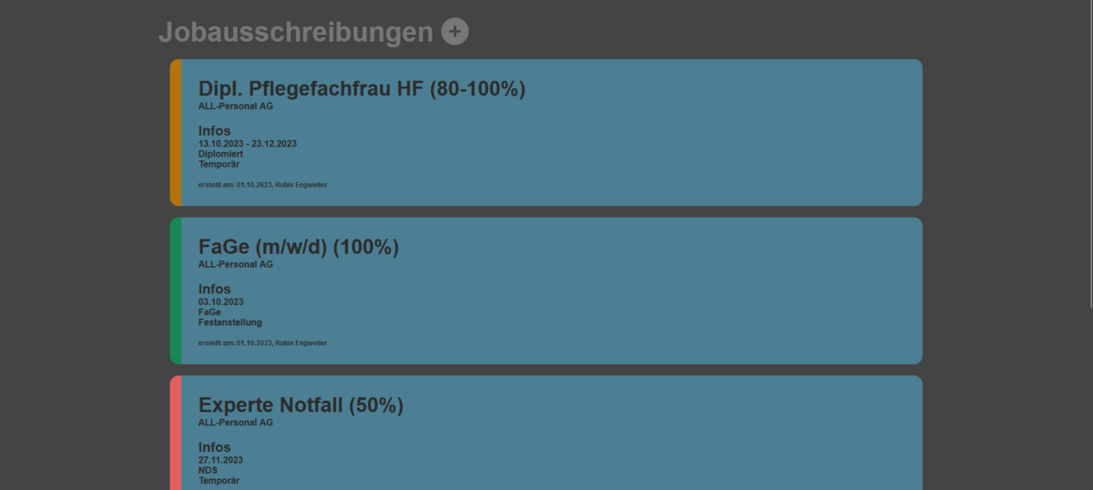 Die Jobs, die ein Büro zur Verfügung hat, werden ebenfalls direkt in diesem Tool erstellt. Dies dient dazu die bestehenden TMA automatisch mit den übereinstimmenden Jobausschreibungen zu verbinden. Damit kann die Personalberater:in den Vermittlungsprozess erheblich verkürzen und somit effizienter arbeiten.