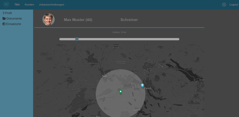 Auf einer Karte sind alle Kunden zu sehen, die sich in einem bestimmten Umkreis um den Wohnort des TMAs befinden. Dieser Umkreis kann den Wünschen des TMAs entsprechend live von der Benutzer:in angepasst werden.