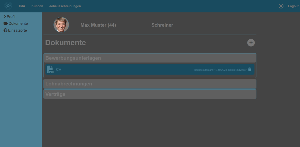 Die Webapplikation soll das Verwalten und Vermitteln von Temporärpersonal effizienter machen. Benutzer:innen können sich in dieser Webapp anmelden. Die angemeldeten Benutzer:innen haben die Möglichkeit, eine Vielzahl von relevanten Prozessen des Tagesgeschäfts zu erledigen. Es können TMAs erstellt, bearbeitet und auch gelöscht werden.