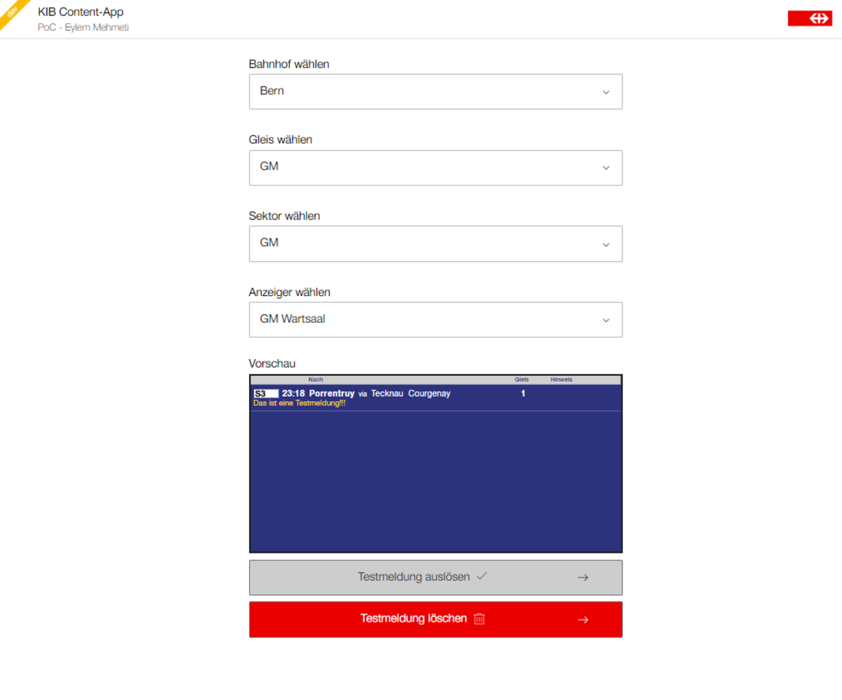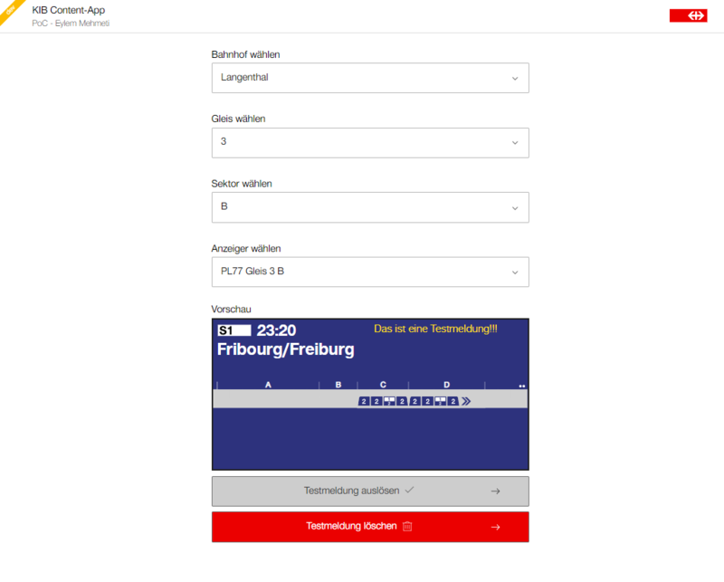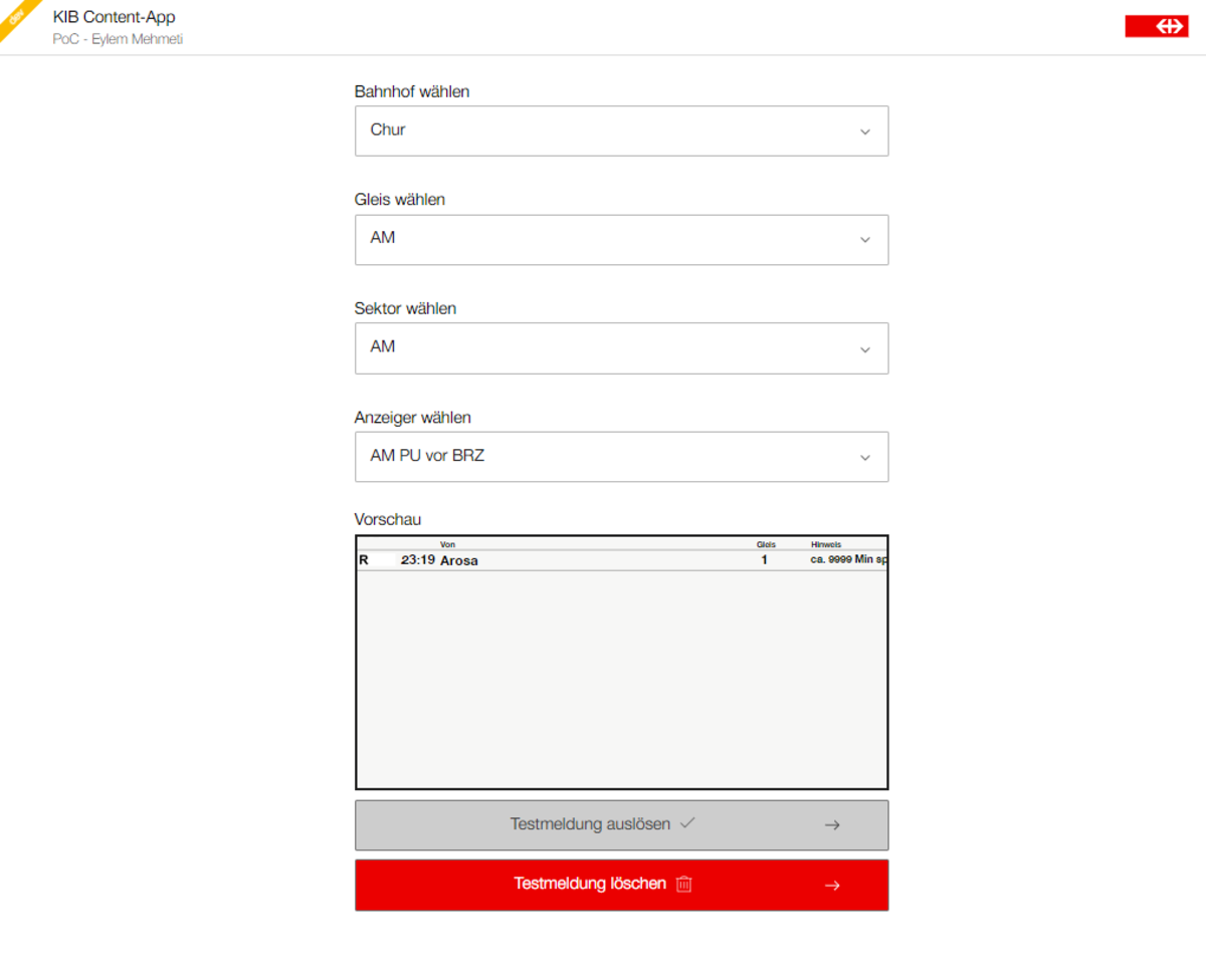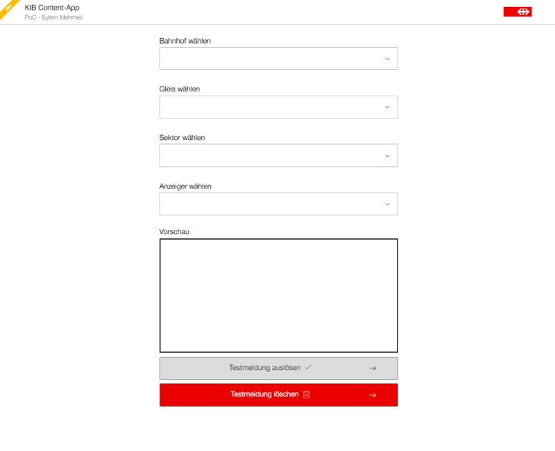 Ausgangslage Die (KIB) Content-App ermöglicht es den Aussendienstmitarbeitenden, fehlerhafte Anzeiger effizienter zu entstören und bietet eine benutzerfreundliche Oberfläche. KIB steht für "Kundeninformation am Bahnhof". Die Applikation liefert Testmeldungen an die Geräte, um deren Funktionalität schnell und einfach zu überprüfen. Damit trägt die Content-App dazu bei, die strategischen Ziele der Schweizerischen Bundesbahnen SBB zu erreichen, insbesondere im Hinblick auf einfache und effiziente Arbeitsumgebungen für die Kundeninformation. Ergebnis Das Hauptziel dieses Projekts bestand darin, die Realisierbarkeit einer benutzerfreundlichen Anwendung zu demonstrieren, die auf den bestehenden technischen Ressourcen und Infrastrukturen der Schweizerischen Bundesbahnen SBB basiert. Die Implementierung des Content-App Proof of Concepts bestätigte die technische Machbarkeit der gewünschten Funktionalitäten. Aufbau Die Content-App wurde mit einer modernen Architektur entwickelt, die auf bewährten Technologien basiert. Die Anwendung verwendet Java Spring Boot für das Backend und Angular in Verbindung mit Esta SBB Angular für das Frontend. Das Backend stellt eine robuste und effiziente Serverkomponente dar. Es bietet eine Schnittstelle für die Benutzeroberfläche und ermöglicht die Verarbeitung von Anfragen und Datenbankzugriffen. Die Daten werden in einer PostgreSQL-Datenbank gespeichert, welche in einem Docker-Container verwaltet wird.Die Applikation ist an zwei externe Schnittstellen angebunden, welche es ermöglichen, mit wenigen Klicks eine Testmeldung zu generieren, diese auf dem Anzeiger zu rendern und sie dem Aussendienstmitarbeitenden auf der Benutzeroberfläche visuell anzuzeigen. Die Angular-Frontend-Komponente bietet eine intuitive Benutzeroberfläche für die Anwender und wurde im Rahmen der Gestaltungsprinzipien der Schweizerischen Bundesbahnen SBB realisiert.Es folgen einige Beispiele aus der Benutzeroberfläche der Content-App, welche die Funktionalitäten der Applikation veranschaulichen.