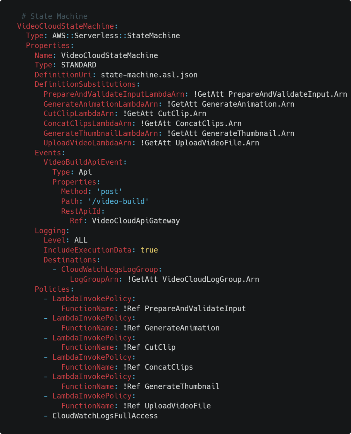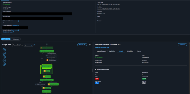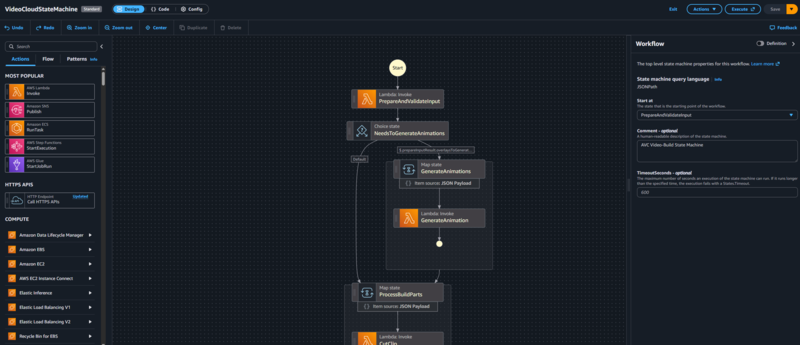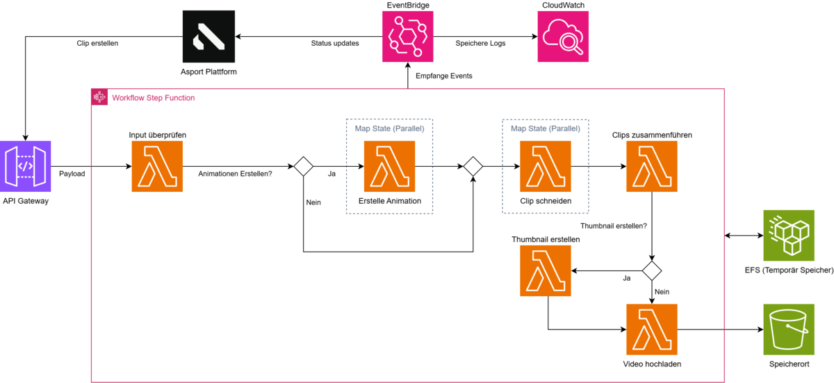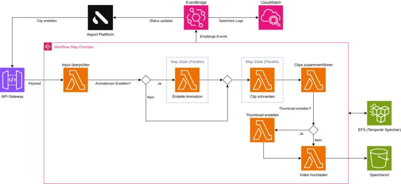 Im Zentrum stehen AWS Lambda-Funktionen, welche sämtliche Verarbeitungsschritte ausführen. Eine zentrale Step Function koordiniert dabei den gesamten Ablauf, vom Schneiden über das Zusammenfügen bis hin zum Upload der fertigen Videos.