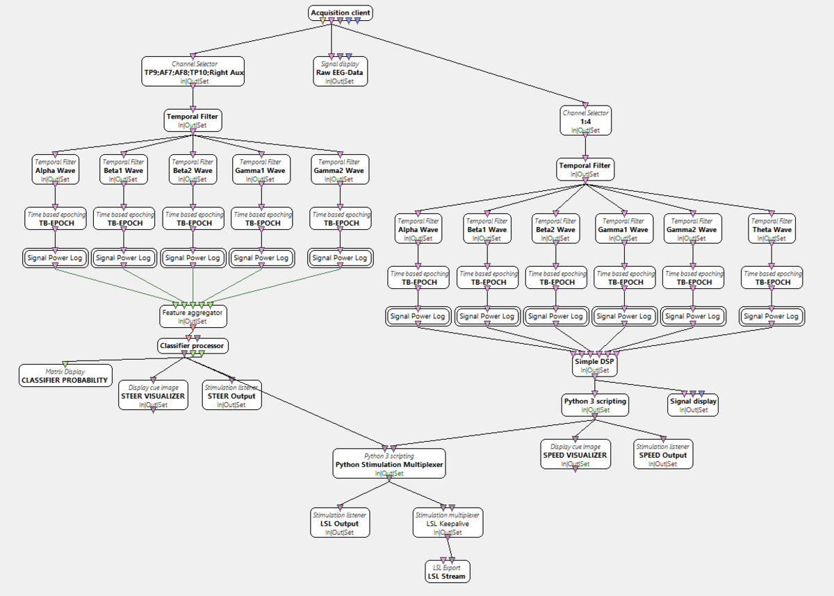 Für die Umsetzung wurde ein EEG-Headset (Muse 2) eingesetzt, das Gehirnaktivitäten über vier Elektroden misst. Mithilfe der Open-Source-Plattform OpenViBE wurden die Rohdaten gefiltert, verarbeitet und über maschinelles Lernen klassifiziert. Die Richtungssteuerung basierte auf Motor Imagery, also der Vorstellung von Bewegung, während die Geschwindigkeit über einen Konzentrationsindex bestimmt wurde. Eine entwickelte Python-Schnittstelle übersetzte die erkannten Befehle in virtuelle Controller-Signale, um ein Fahrzeug in der Simulation «Assetto Corsa» zu steuern.