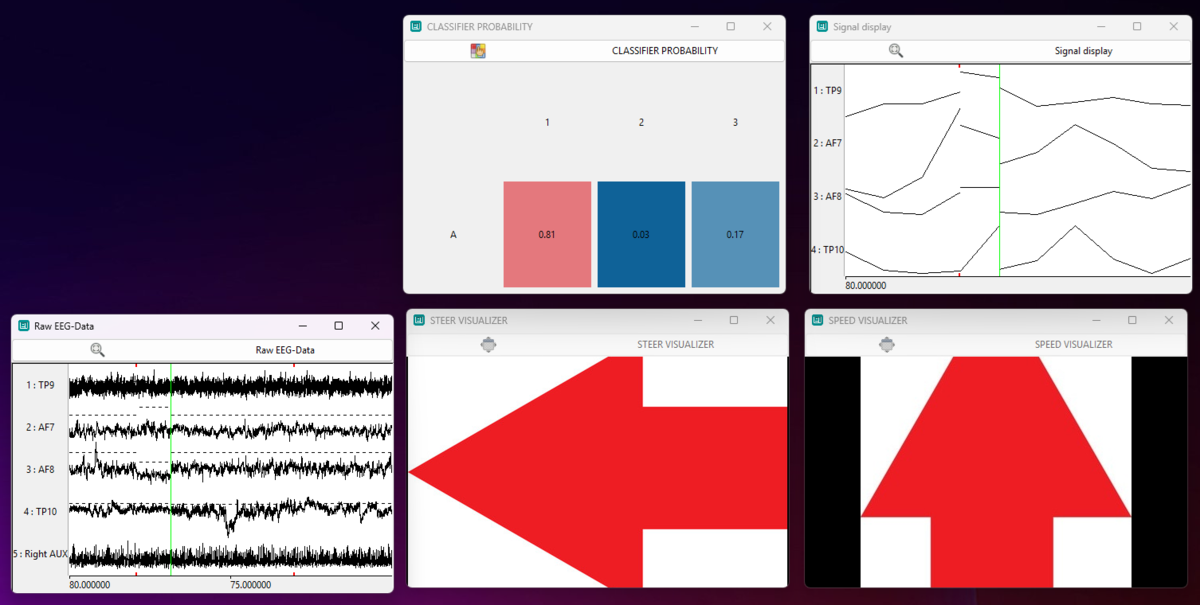 Das Ziel der Arbeit war es, ein funktionsfähiges Gesamtsystem zu entwickeln, das EEG-Daten (Elektroenzephalografie) in Echtzeit erfasst, verarbeitet und diese mithilfe von Machine-Learning-Modellen in Steuerbefehle übersetzt. Im Mittelpunkt stand dabei die Nutzung von Motor-Imagery-Signalen (motorische Vorstellungen) für die Richtungssteuerung sowie eines Konzentrationsindex für die Geschwindigkeitssteuerung. Das übergeordnete Ziel war, die technische Machbarkeit einer mentalen Steuerung durch einen Konzeptnachweis zu demonstrieren und zugleich einen Beitrag zur Barrierefreiheit im Alltag aufzuzeigen.