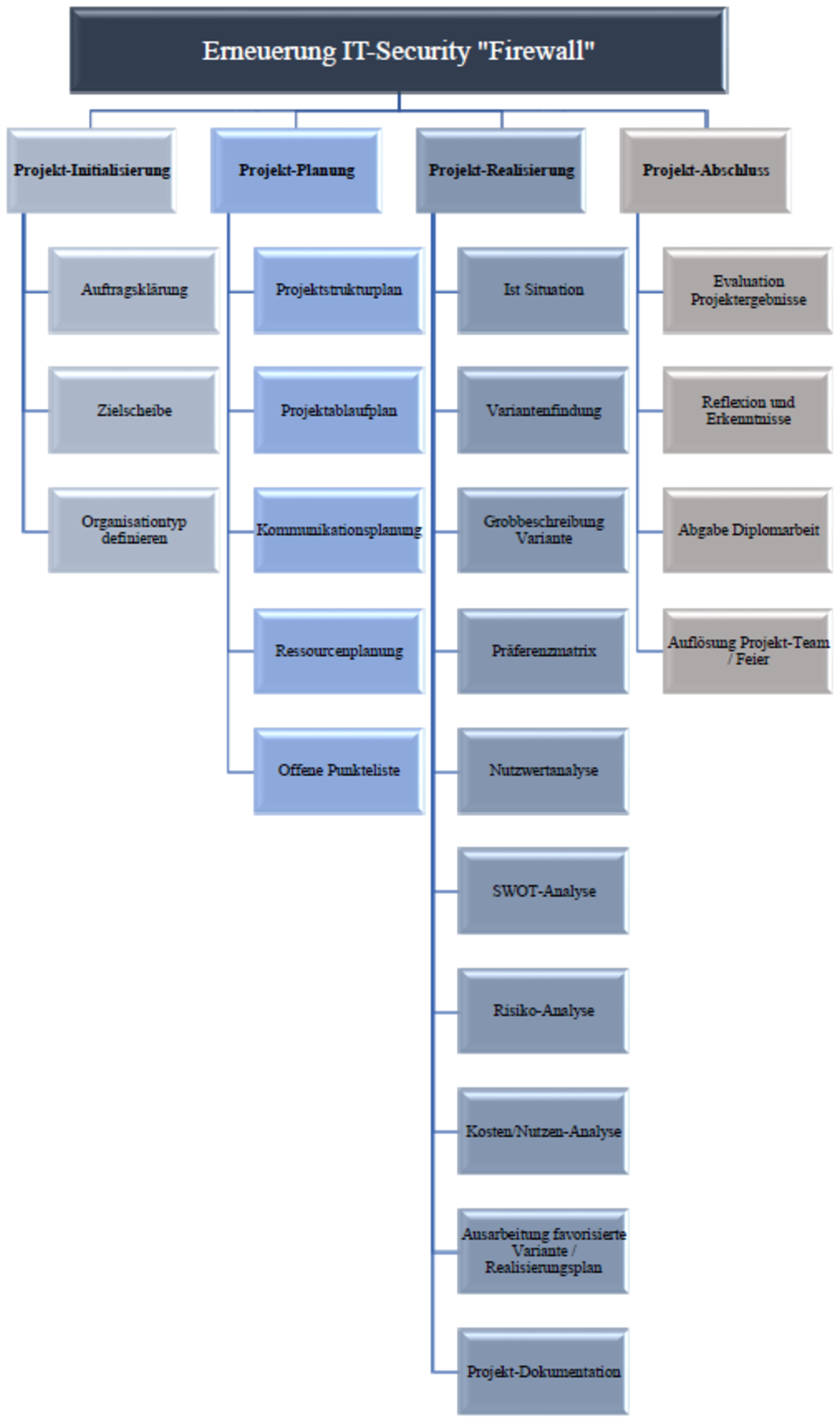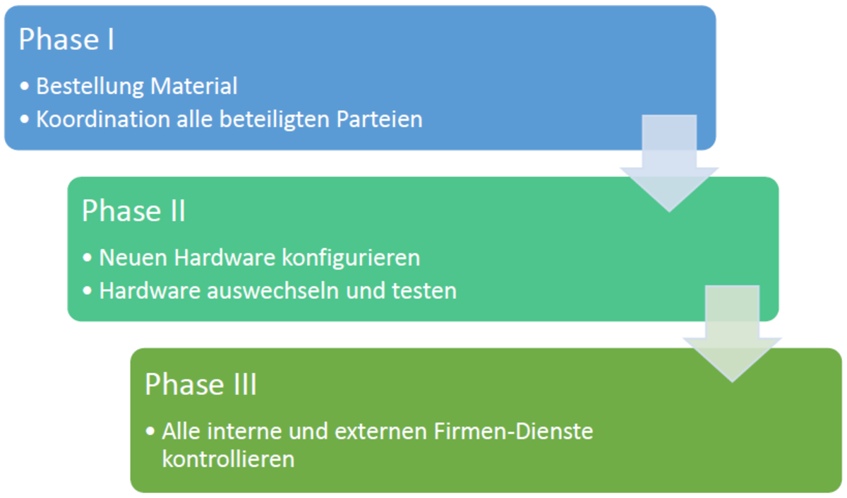 Mit den vier Phasen des Projektmanagements und des Projekt-Strukturplans konnte das Projekt in kleineren Arbeitspaketen abgearbeitet werden. Die Arbeitspakete wurden in einem Ablaufplan zeitlich darstellt. So war klar, welches Arbeitspaket im nächsten Schritt zu erledigen war. Alle Erfolgskriterien wurden konfiguriert, getestet, dokumentiert und erfolgreich umgesetzt.