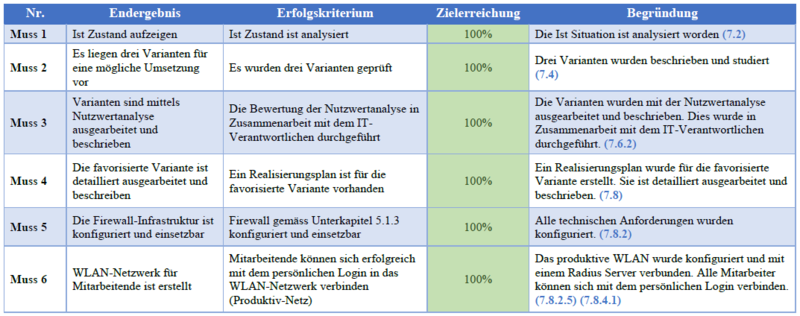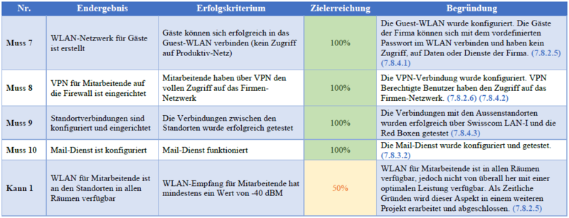 Alle gesetzten Ziele, und somit die Wünsche, des Auftraggebers wurden erfüllt. Der Auftraggeber ist sehr zufrieden und der Aufbau des Firewalls sowie Unterlagen für die Mitarbeiter und die IT-Abteilung sind dokumentiert. So besteht die Möglichkeit, in Zukunft weiterhin die Firewall zu erweitern oder anpassen.