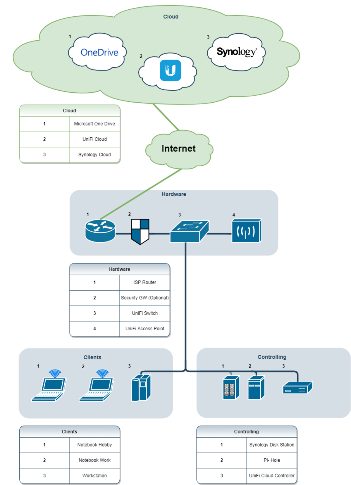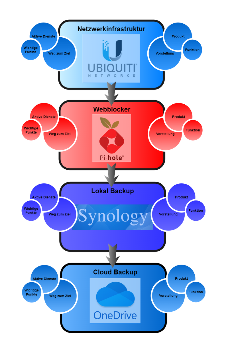 Bei den Netzwerkkomponenten wurde Ubiquiti Hardware und für die Backuplösung ein NAS von Synology eingesetzt. Da Werbung während dem Surfen stört wurde ein Pi-Hole eingerichtet. Für die Security ist der Router des Providers zuständig. Da ein Router als Security- Lösung, sprich als Firewall, ziemlich eingeschränkt ist, wäre eigentlich die Integration eines Security Getaway von Ubiquiti angedacht gewesen. Leider ist dieser wie so oft bei neuer Hardware bis auf weiteres nicht erhältlich.