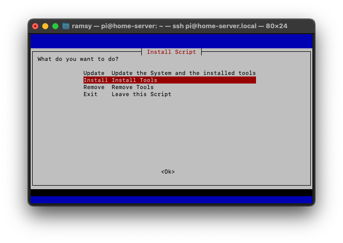 Das erstellte Script kann das System und Applikationen installieren, updaten und deinstallieren. Alle Installationen sind via Docker Container voneinander getrennt. Als Grundlage wird immer der Nginx Reverse Proxy und Certbot installiert. Nginx übernimmt die verschlüsselte Kommunikation zwischen Client und Raspberry Pi. Certbot erstellt das Zertifikat, welches für die Verschlüsselung notwendig ist und erneuert dieses vor dem Ablauf.