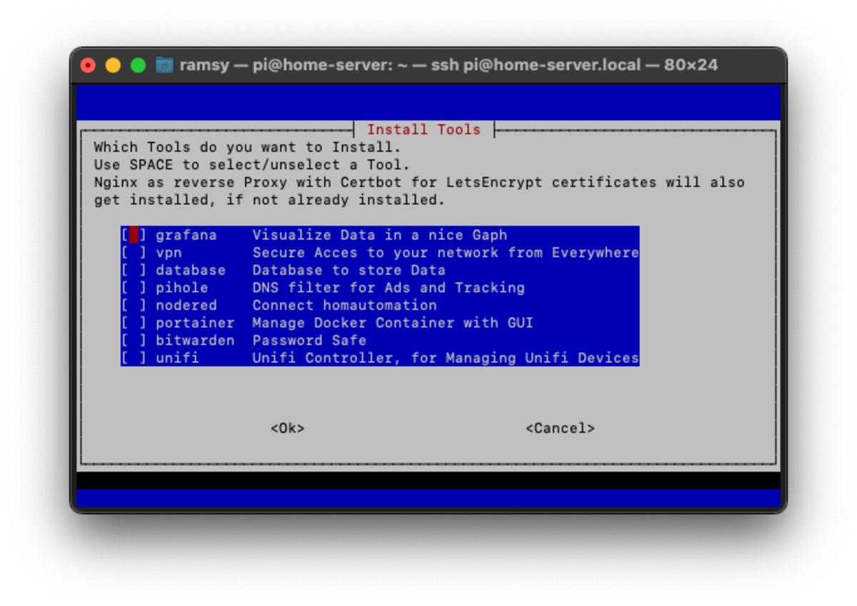 Folgende Container können installiert werden: Portainer, Pi-hole, WireGuard VPN, Bitwarden, Node- RED, MySQL Database mit Adminer, Grafana und Unifi.