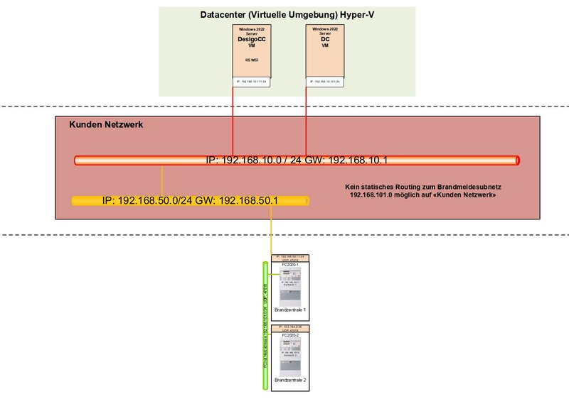 In unserem Team haben wir einen Auftrag für ein Desigo CC Managementsystem erhalten, welches als zentrale Einheit für die Alarmierung + Bedienung der Brandmeldeanlagen dienen soll. Diese Brandmeldegeneration (BMA Sinteso FS20) verfügt über eigene Netzwerksubnetze. Da wir bei unserem Kunden nun keine «statischen Routen» in der bauseitigen Netzwerkinfrastruktur auf die Sinteso FS20 Subnetze erstellt erhalten (Nicht möglich), muss nun eine Lösung kreiert werden, damit die Brandmeldezentralen trotzdem vom Desigo CC Leitsystem erreicht werden können.