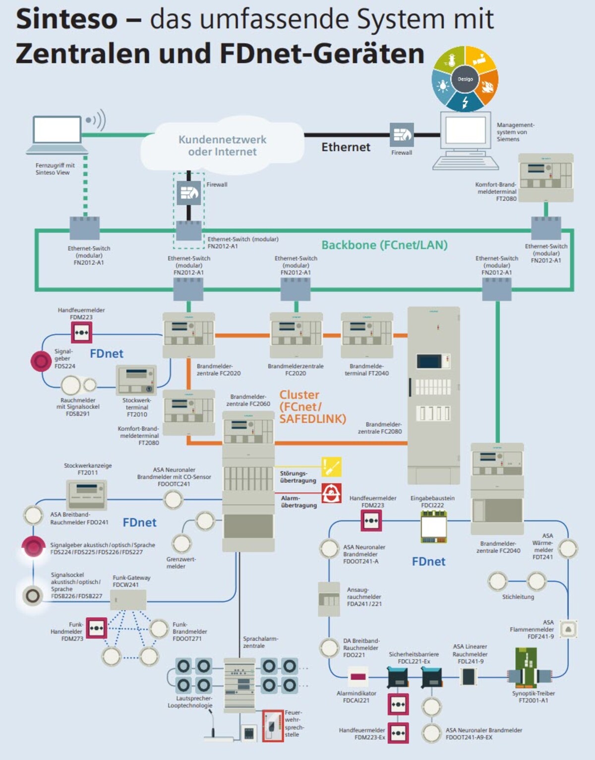 (Siehe Bild: Produktelösungen: Sinteso FS20 Brandanlagen + Desigo CC Managementsystem)