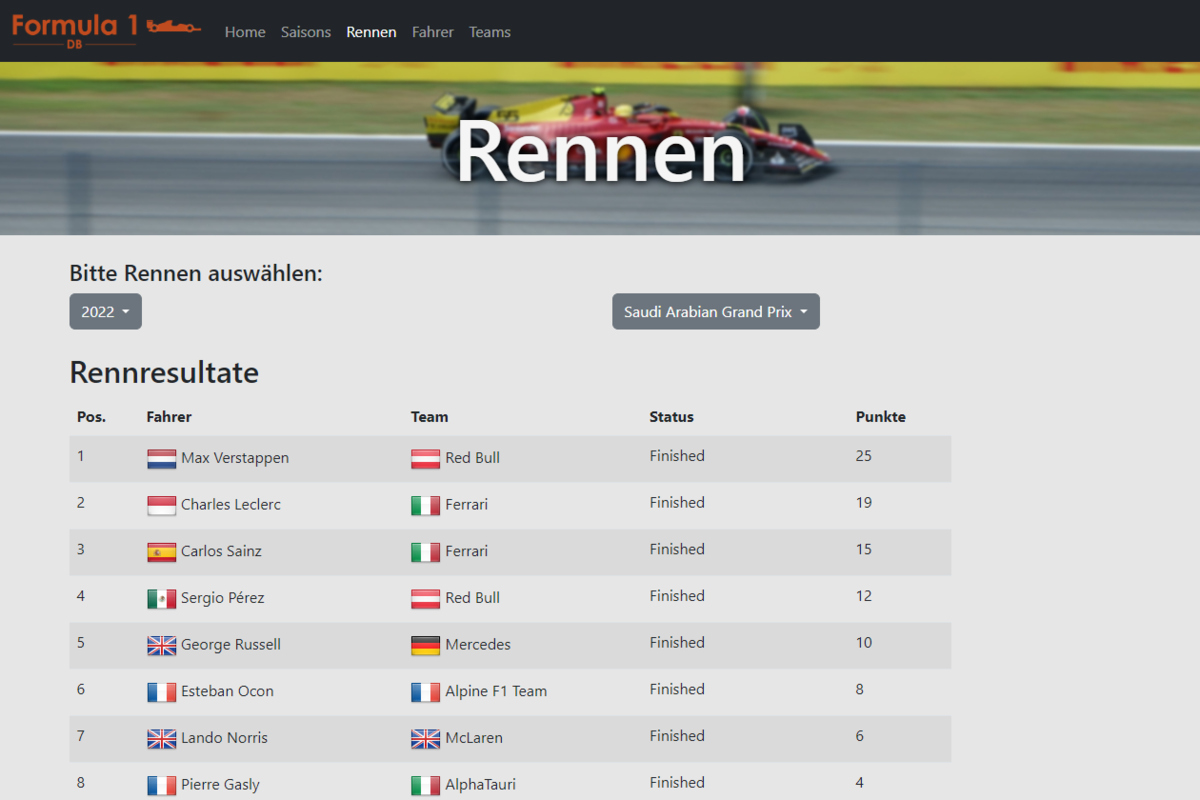 Für vordefinierte Daten (wie aktuelle Fahrer, letzte Rennergebnisse usw.) wird ein Master-SQL-File geführt. Die dabei erstellten SQL-Views werden anschliessend in den Seiten der Webseite mit php aufgerufen. Bei Daten, welche der Benutzer noch Auswahlen treffen kann (z.B. welche Saison / welches Rennen), wird der SELECT-Befehl direkt in die Seite implementiert.