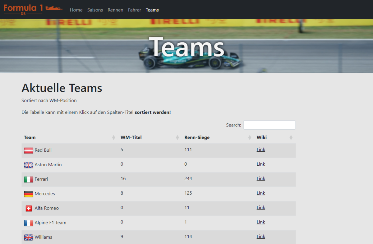 Die Formel 1 ist die Königsklasse im Automobil-Rennsport. Die erste Formel 1-Saison fand im Jahr 1950 statt. Mit über 1.000 Grand-Prix-Wochenenden, die jeweils aus Training, Qualifying und Rennen bestehen, gibt es eine enorme Menge an Daten, die für neue Formel 1-Fans etwas überfordernd sein können. Um Formel 1-Neulingen einen einfachen und übersichtlichen Einstieg in die Welt der Formel 1-Statistik zu ermöglichen, wird eine neue zentrale Webplattform entwickelt.